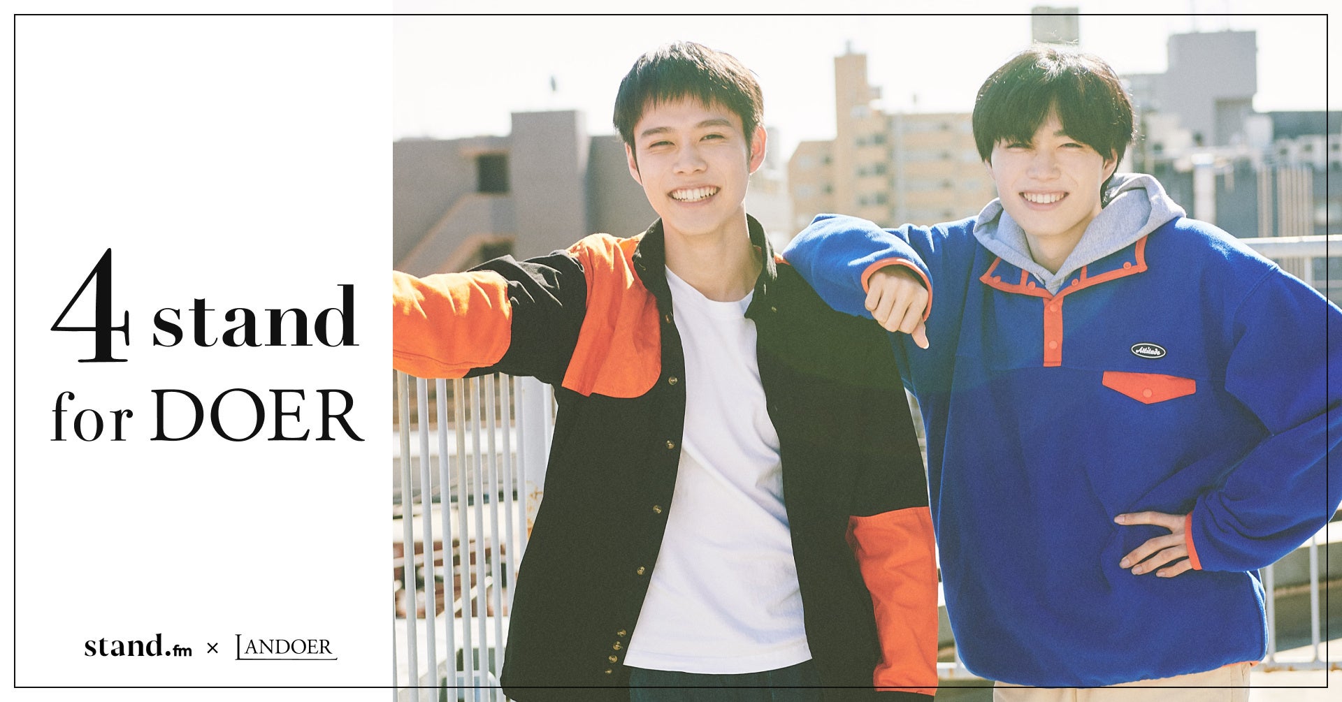 株式会社stand.fm(本社:東京都渋谷区、代表取締役 共同代表:河合真吾・中川 綾太郎)はこのたび、ウェブメディア「LANDOER(ランドゥーア)」とのコラボ企画【4 stand for DOER】を、5月1日(日)より開始いたしました。第1弾として、アミューズ所属の俳優・福崎那由他と細田佳央太が登場し、LANDOERで配信されたインタビュー記事を読みながらのトークや、リラックスした状態で2人の日常が垣間見えるようなコンテンツなど、合計4つの音声コンテンツを配信いたします。stand.fmのアプリをダウンロードすると他のアプリを起動しながらでも音声が聴ける「バックグラウンド再生」が可能ですので、ぜひLANDOERの記事を読みながら、stand.fmのコンテンツをお楽しみください。