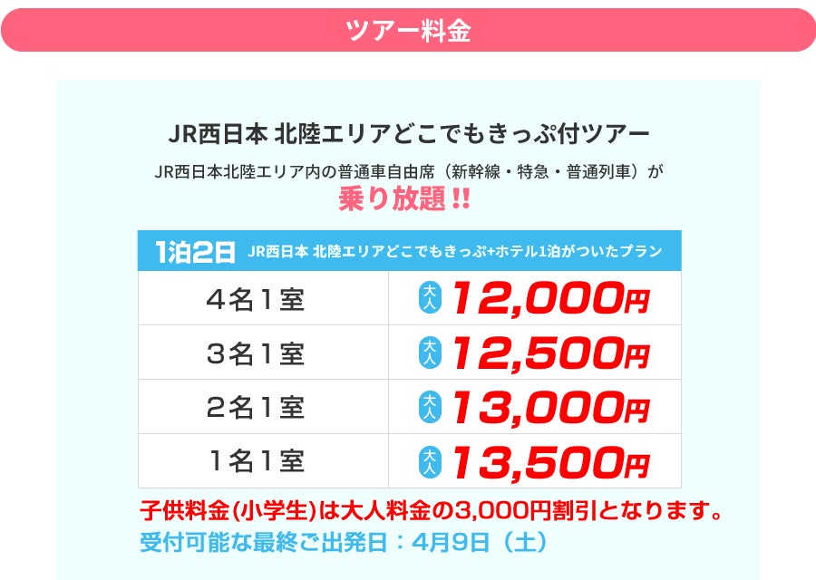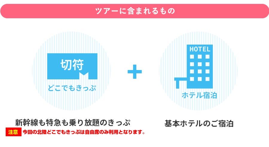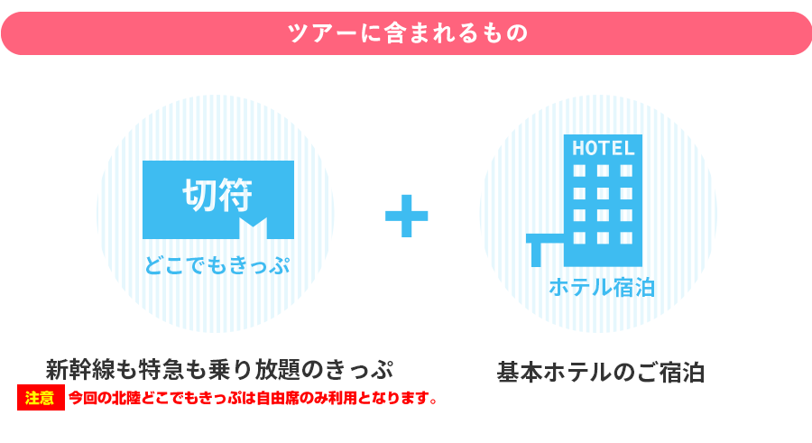 旅行会社限定のJR西日本 北陸エリアどこでもきっぷとホテル宿泊がセットになったツアーです。