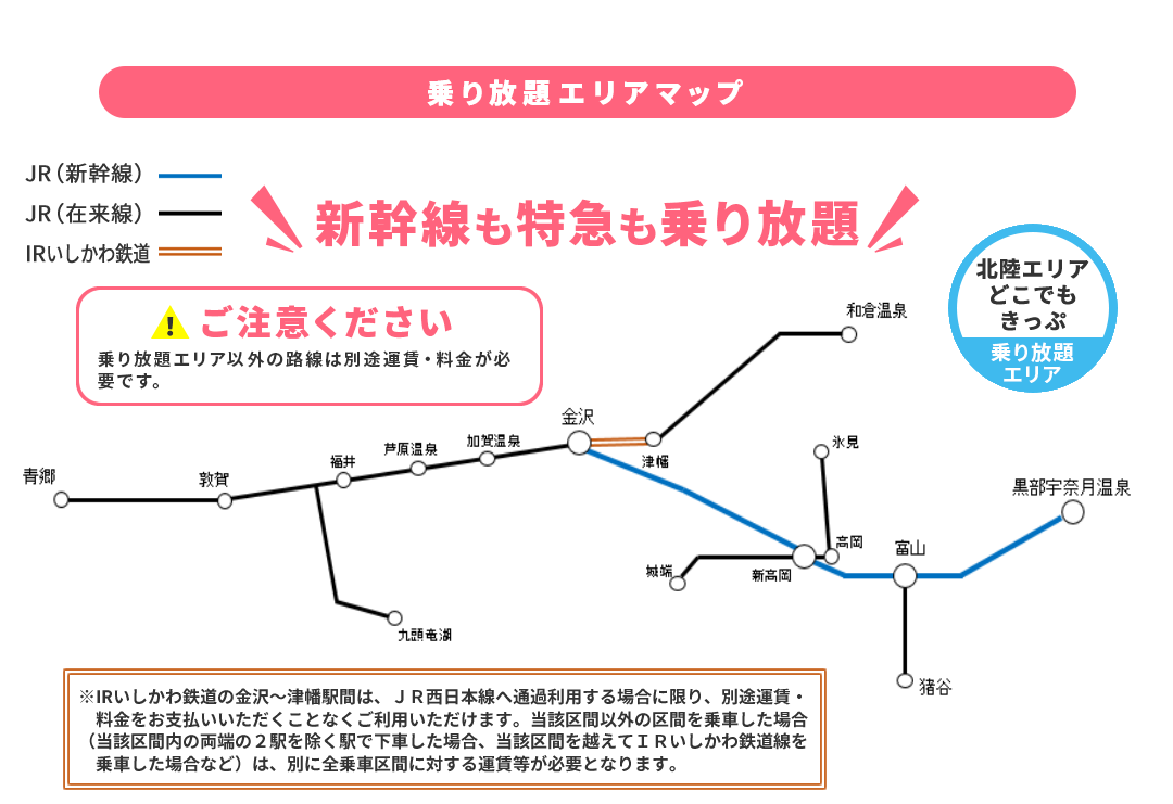 ※IRいしかわ鉄道(金沢~津幡駅間以外)、あいの風とやま鉄道、のと鉄道などは、ご利用になれません。