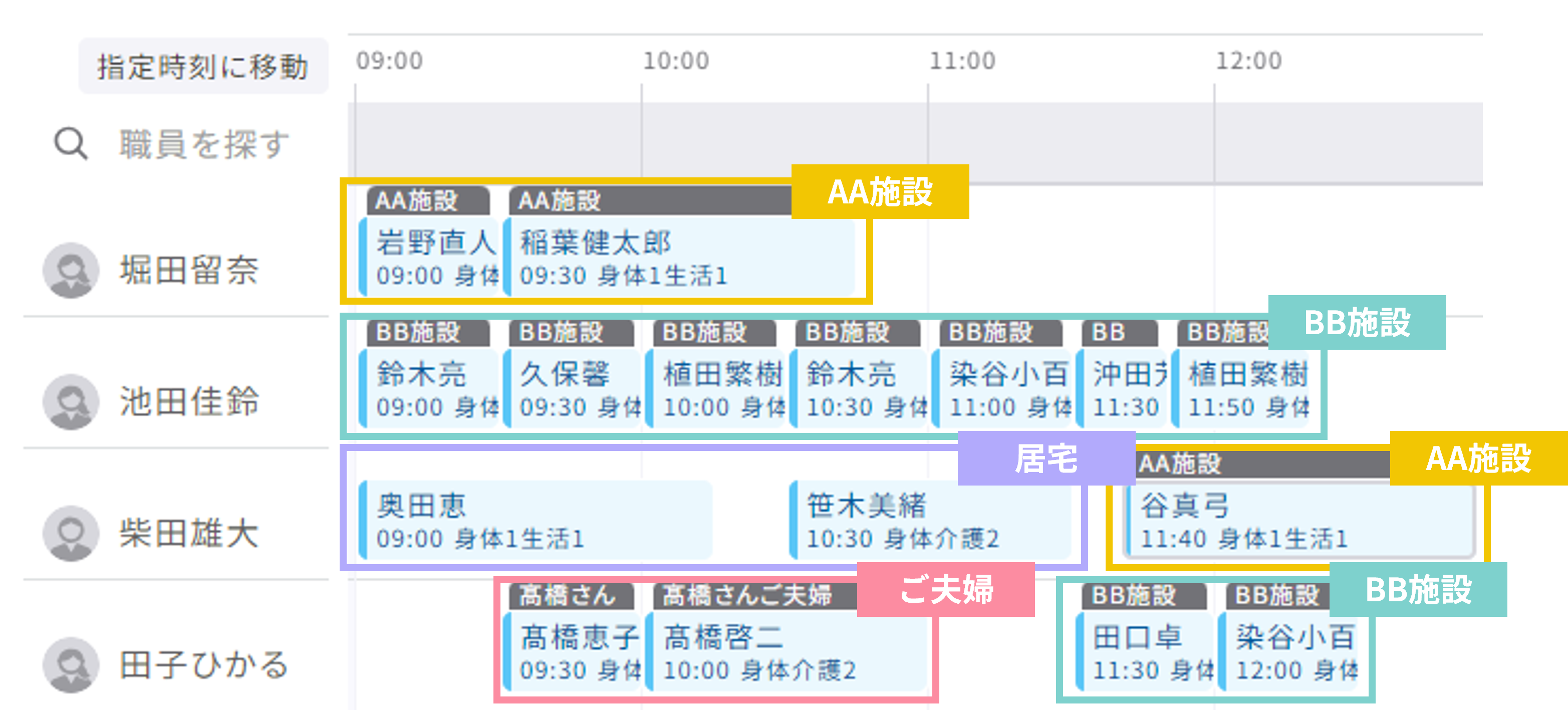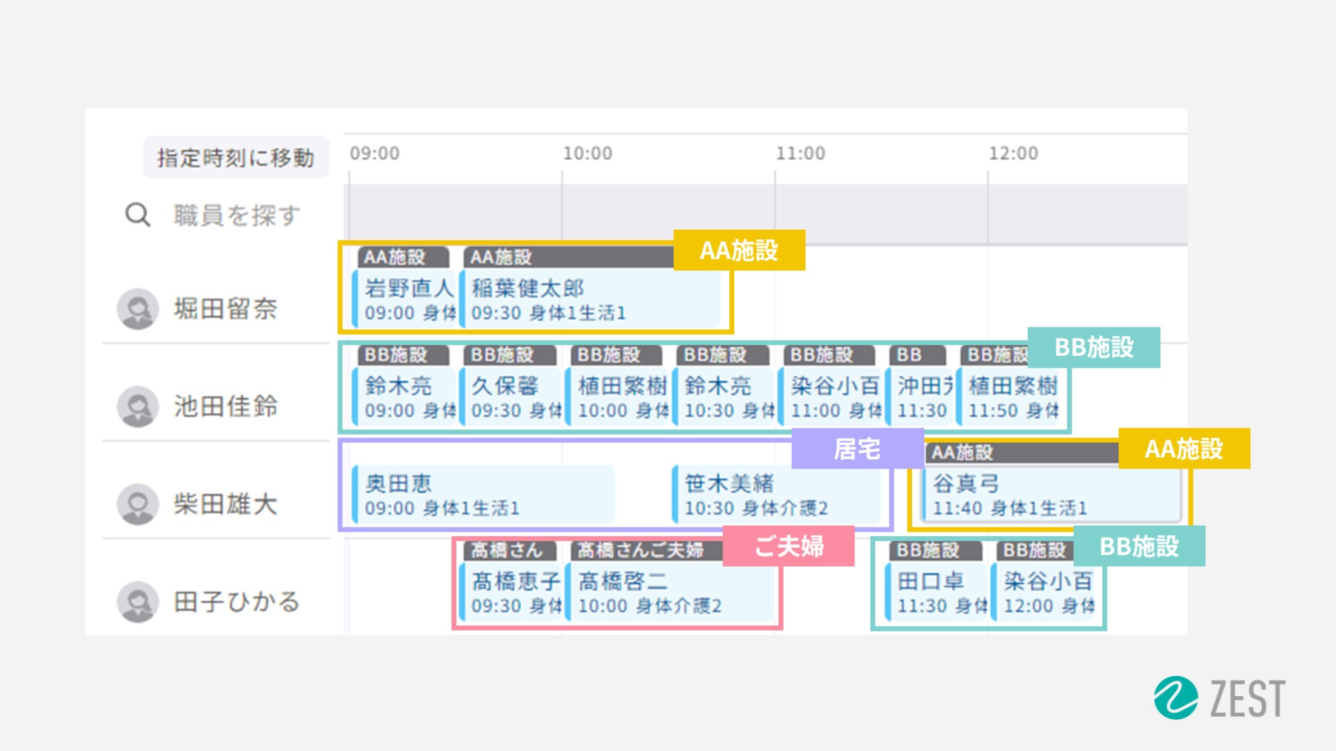 1つの施設内を訪問するだけでなく、複数の施設を訪問するケースや居宅と施設の訪問を同時に実施する事業所も多いのが実情です。そのためZEST SCHEDULEでは、訪問するチーム設定を通じ、施設Aのチーム・施設Bのチームなどチーム設定を任意に行うことも可能です。また施設訪問の場合は訪問するご利用者のお名前に加え、施設名(ご夫婦であればその旨)を同時に表記しますので、管理者や訪問職員がスケジュールを見た際に、それが一目で判断できる仕様となっています。