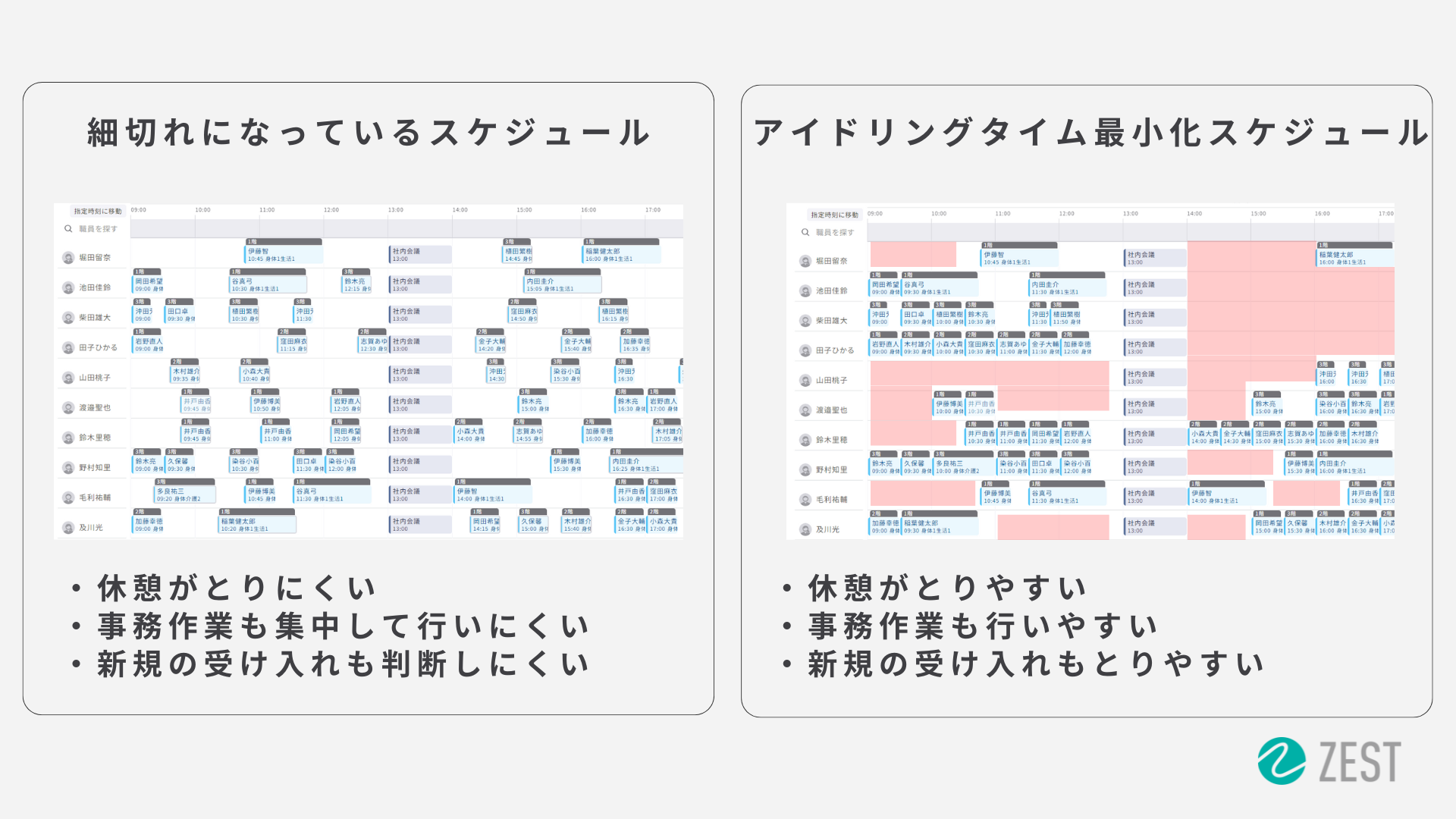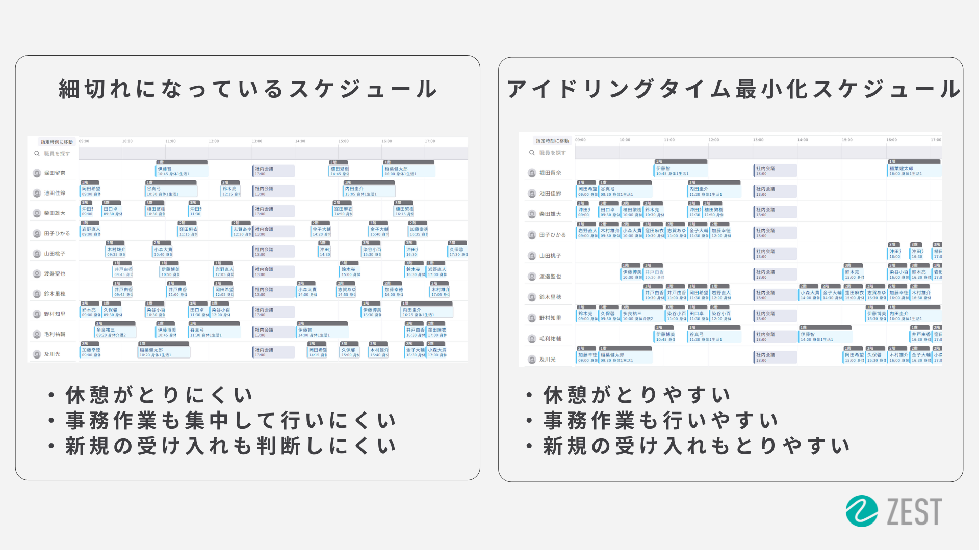 細切れに訪問をする場合、中途半端な空き時間になってしまうことで、1) しっかりとした休憩時間に充てることや、集中した事務作業時間の確保をすることが難しく、また 2) 新規の相談があった場合にも調整が困難になってしまいます。ZEST SCHEDULEの新AIでは移動時間の最適化はもちろん、アイドリングタイムも踏まえた最適化を実現可能であり、まとまった空き時間を創出することで上記の課題にアプローチすることが可能です。