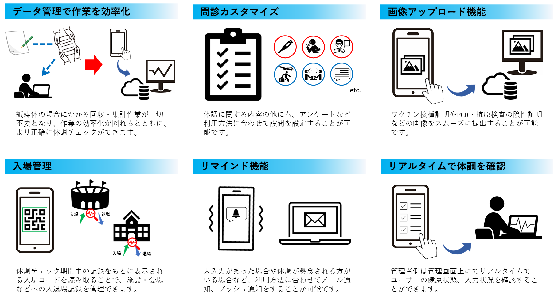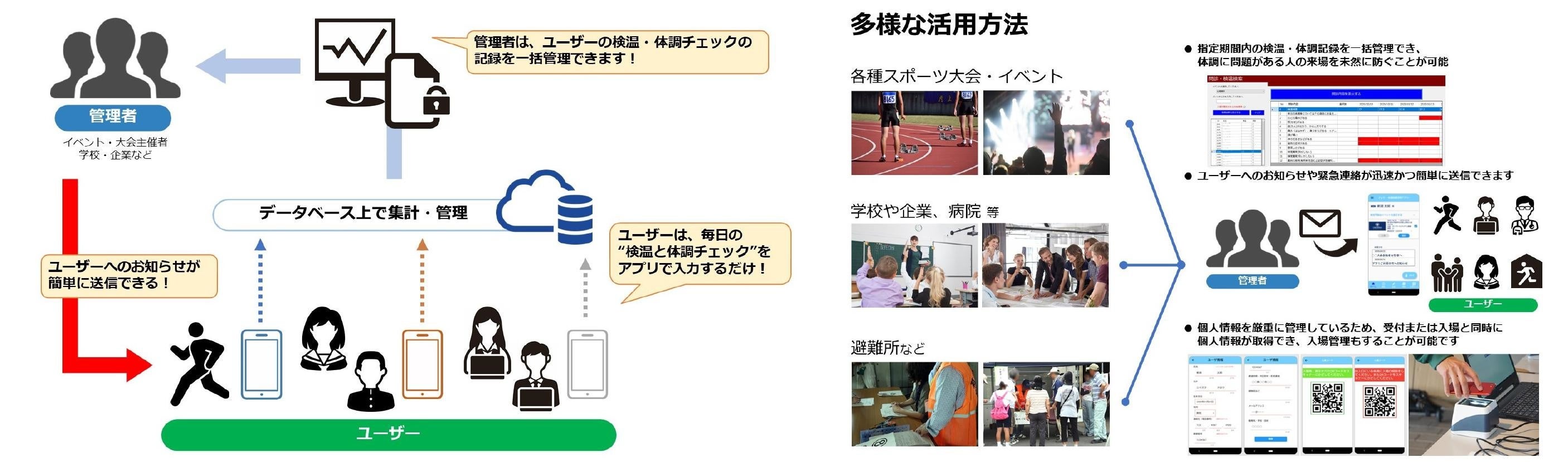 またスポーツイベントのウイルス対策だけではなく、職場や学校現場での健康管理、催事での入場管理、利用者からのアンケート調査などのシーンでもご利用いただけます。
