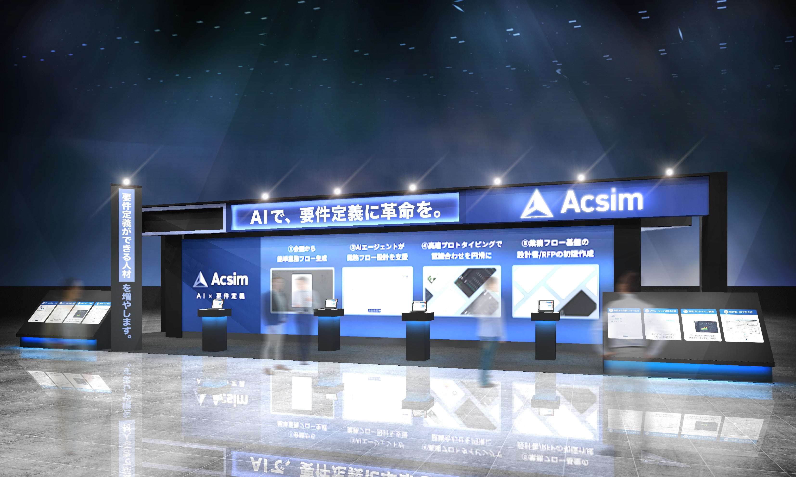 今回のブースでは、「要件定義を、確実に、カンタンに、誰でも」をテーマに、AIがプロジェクトの目的や背景を理解し、文脈に沿って最適な出力を導くAcsimの進化をご体験いただけます。