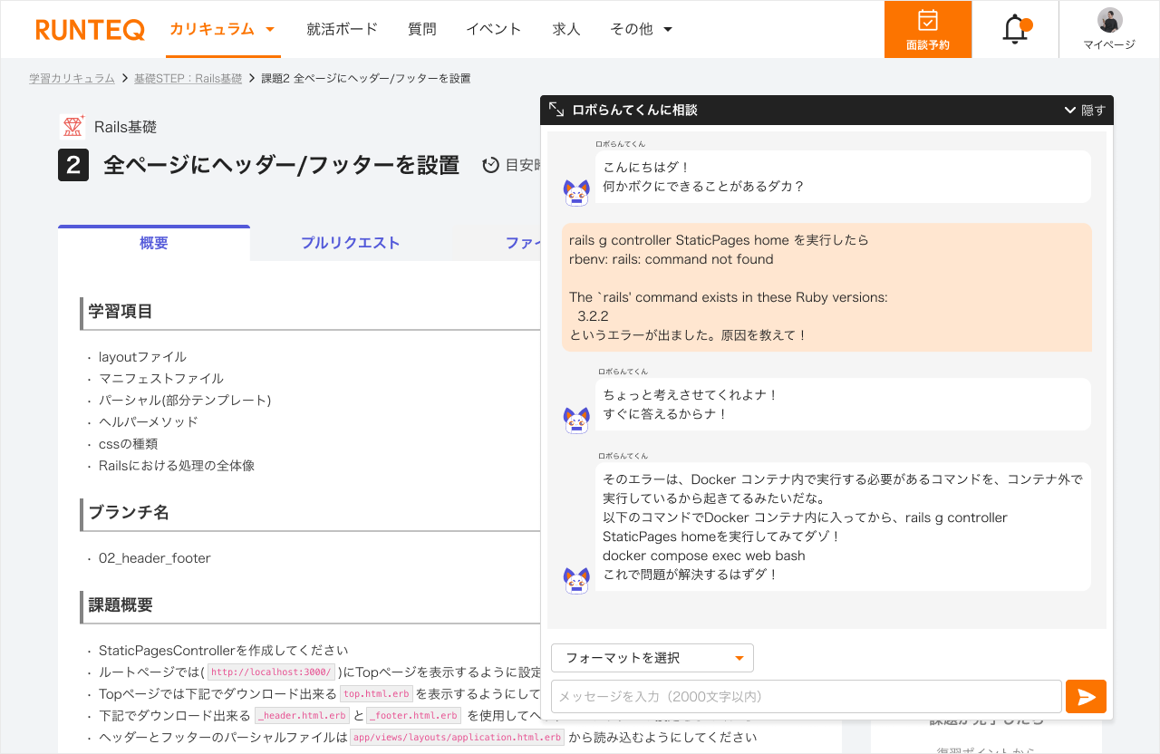 RUNTEQの講師に寄せられた過去の質問を精査し、独自のデータベースを構築しました。RUNTEQでよくある質問や、特殊な環境でしか発生しないバグなどにも対応が可能です。