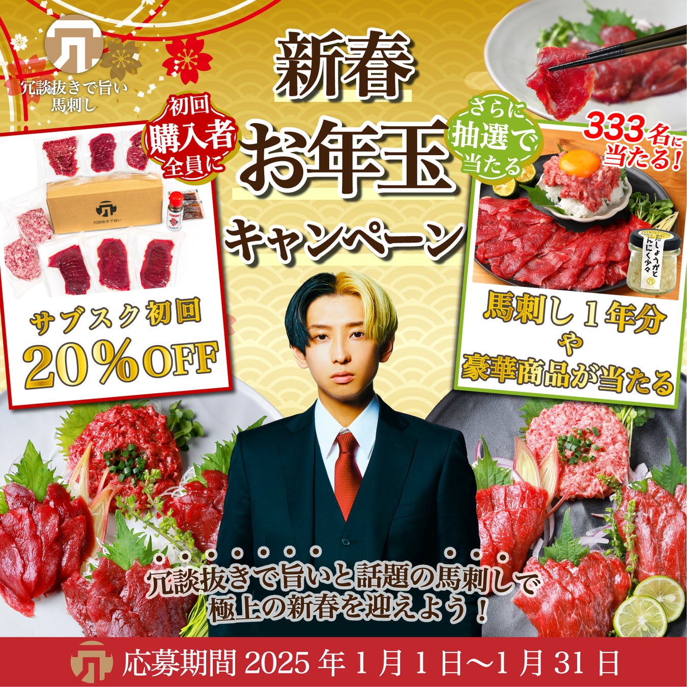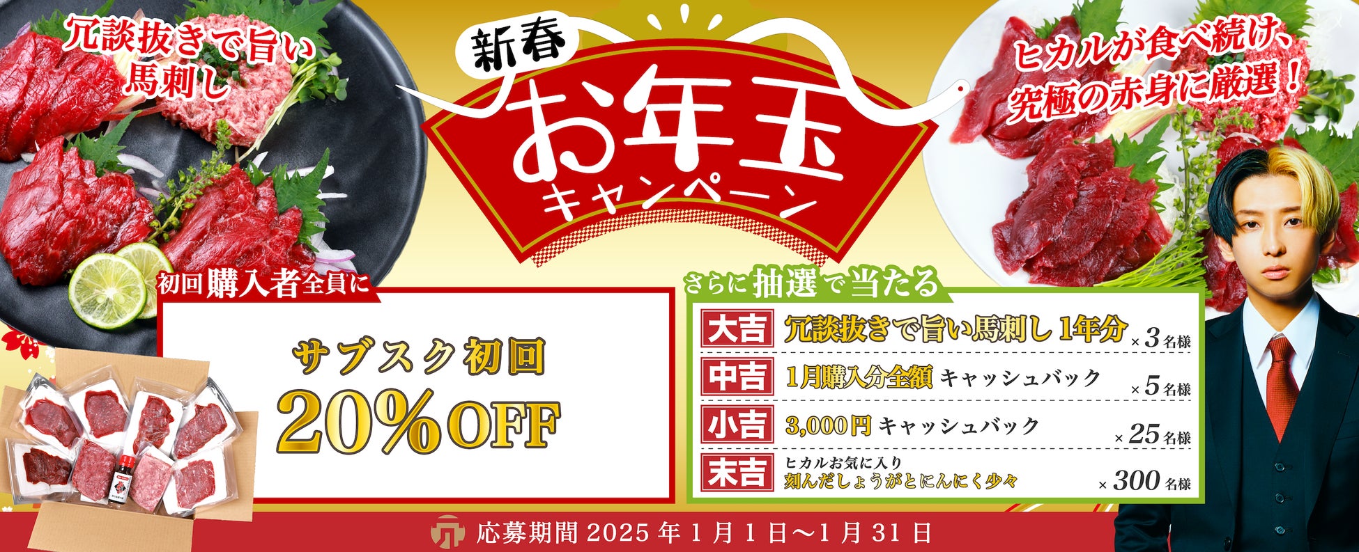 初回購入が20%オフ!さらに馬刺し1年分など豪華賞品が当たる新春お年玉キャンペーンを開催します。