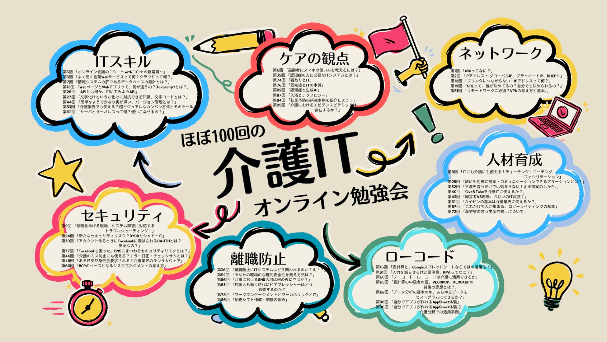 「介護ITオンライン勉強会」は、介護・福祉業界に関わる方々が、ITの基礎からIT機器運用ノウハウまで学べる勉強会です。 10回参加し・3回以上発表された方には、「介護ITインストラクター」の修了を認定いたします。