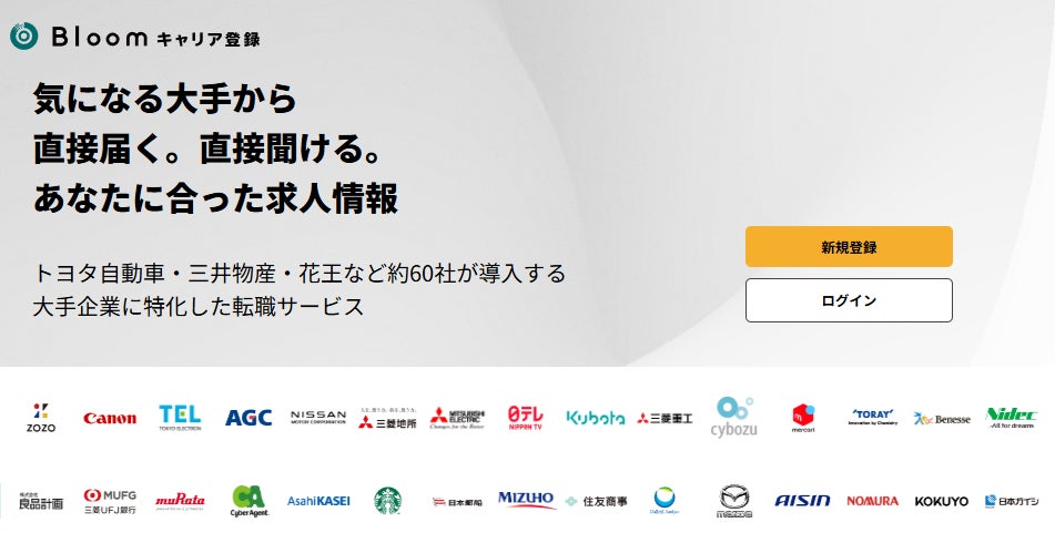 「Bloomキャリア登録」は、大手企業に特化した転職・キャリア採用プロダクトです。転職検討者は気になる大手企業を選択してキャリア情報を登録でき、経験に合った募集ポジションの案内を企業から直接受け取ることができます。2026年2月時点で67社に導入されており、トヨタ自動車、三井物産、住友商事、サントリーホールディングス、花王、KDDI、楽天グループ、NTTドコモ、野村證券、三菱地所、三井不動産など、多くの企業で活用が進んでいます。