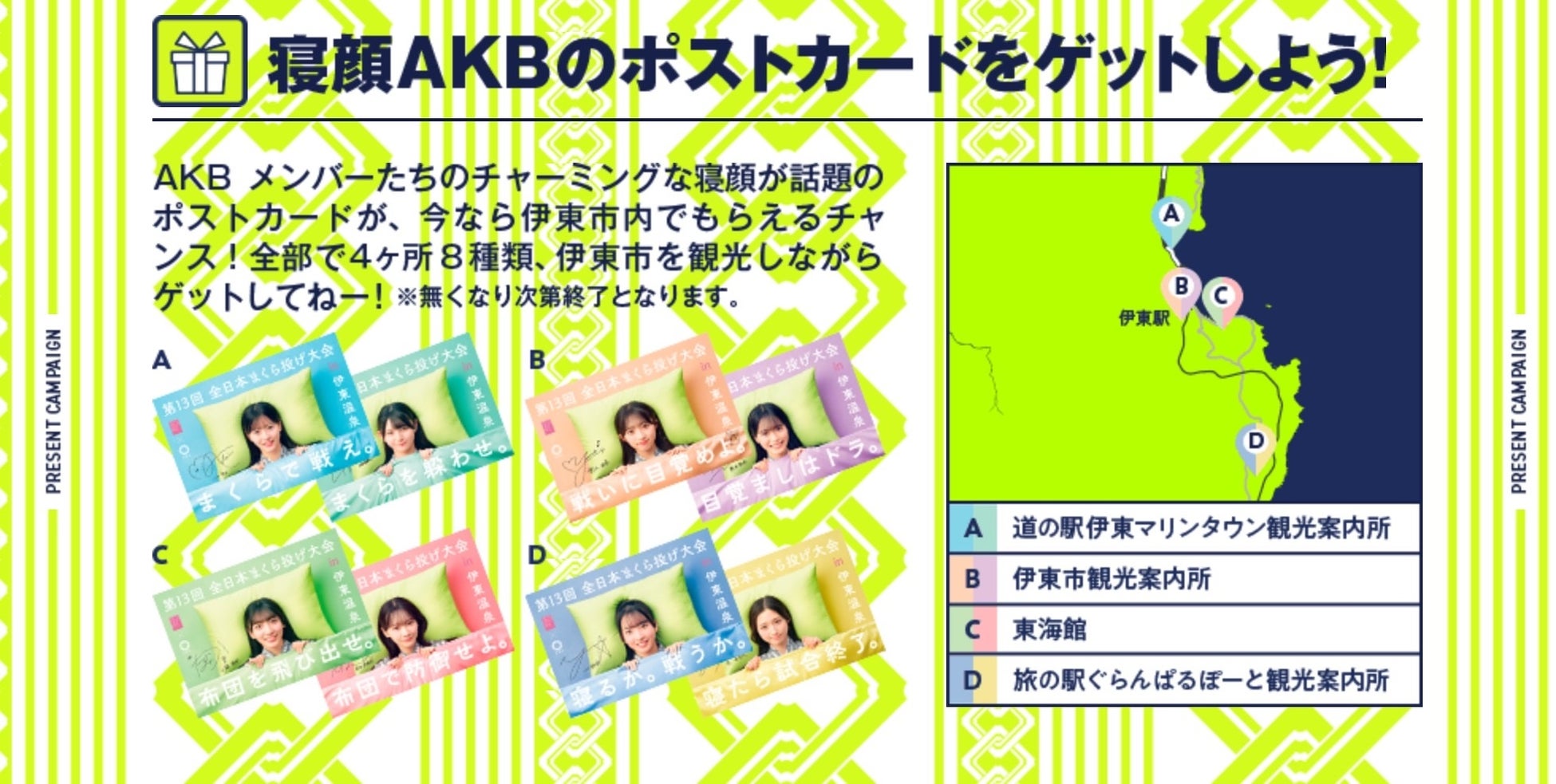 今回はポスターだけでなく、ポストカードを製作し、3月15日(土)より伊東市の観光スポット4か所にAKB48 18期研究生8名それぞれのポストカードが設置される「寝顔AKBのポストカードをゲットしよう!」キャンペーンを実施します。