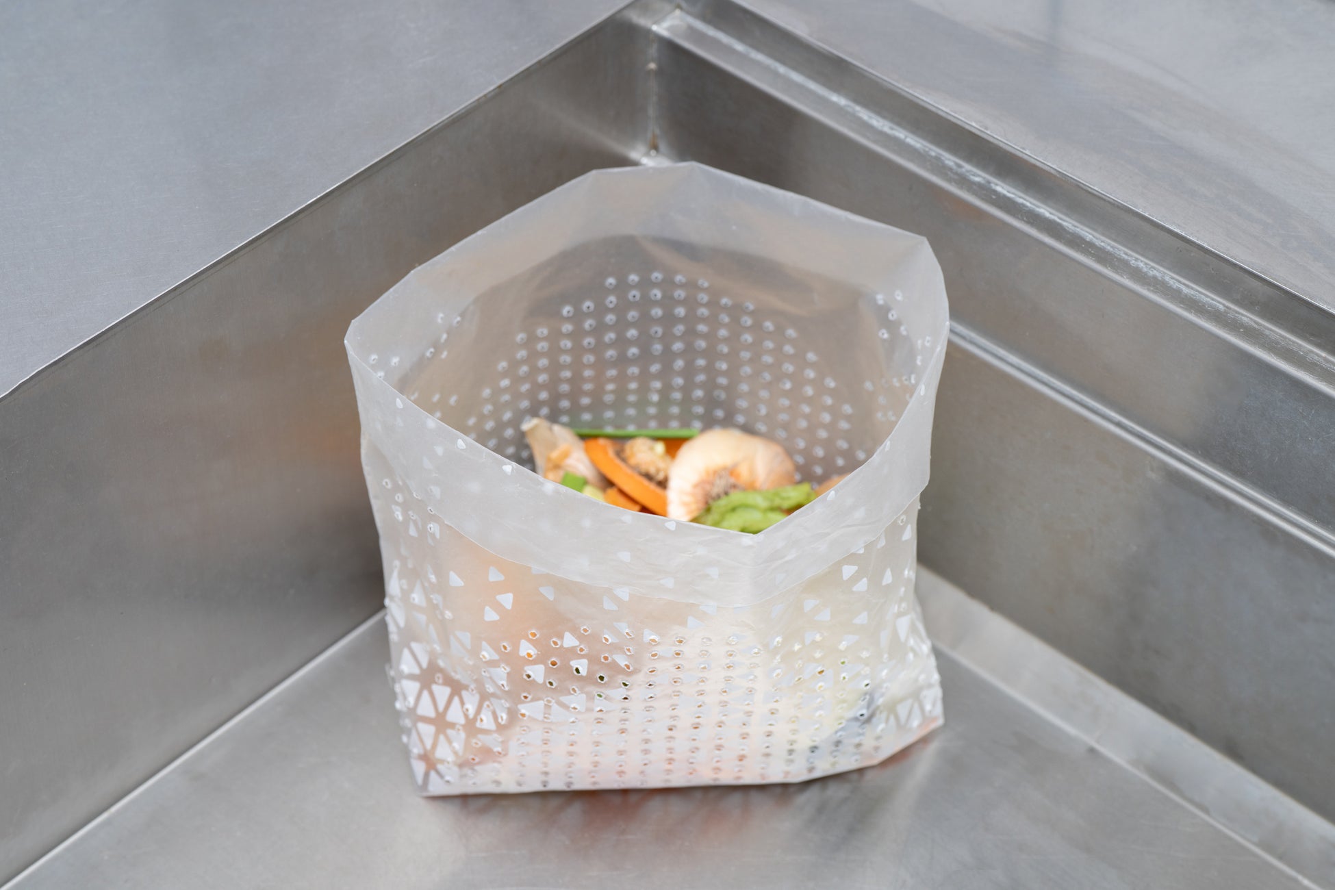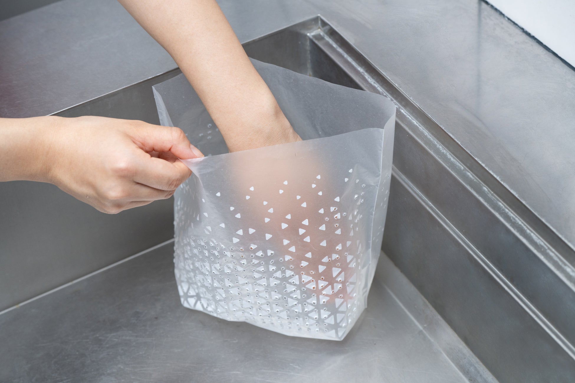 ダストマン不織布タイプは、穴あきメッシュ構造で、小さなゴミもしっかりキャッチし水切れもスムーズな水切りゴミ袋です。