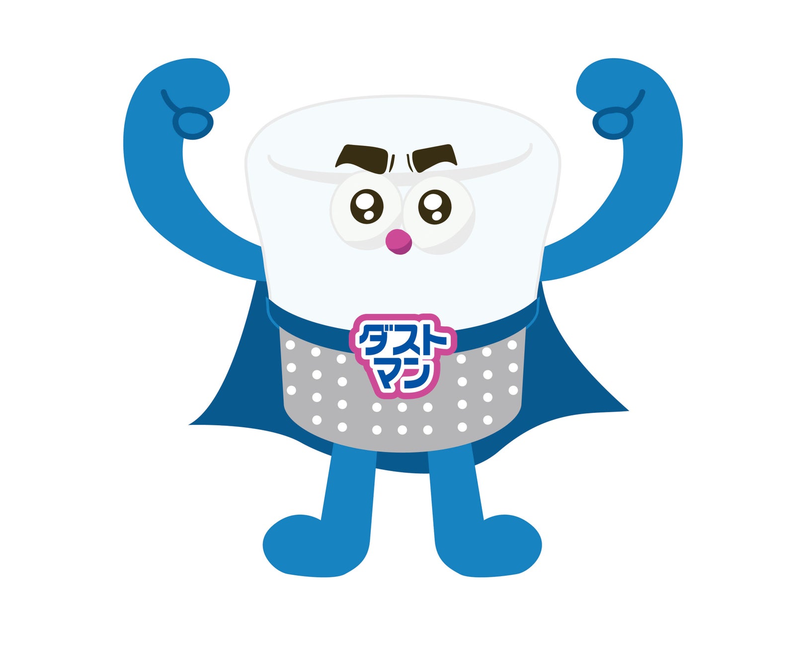 特徴は、ダストマンの最大の特長である「抗菌効果」を表すポーズ・表情・マントと、キャラクター名かつ商品名をベルトに入れることで名前を覚えてもらいやすくしたことです。顔は商品自体の袋、胴体を排水口とすることで、ダストマン使用方法を一目で分かるようにしました。『ダストマン』は、クールで知的、常に落ち着いている性格の、排水口まわりの”清潔のエージェント”です。