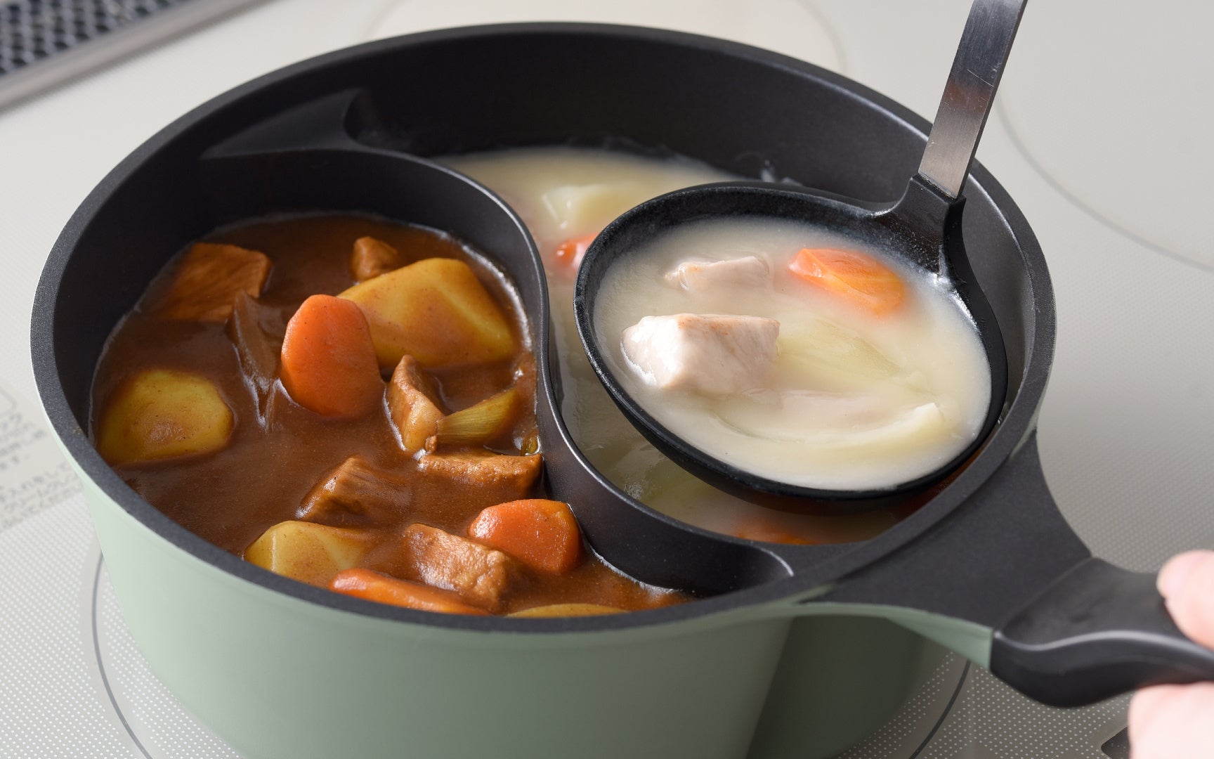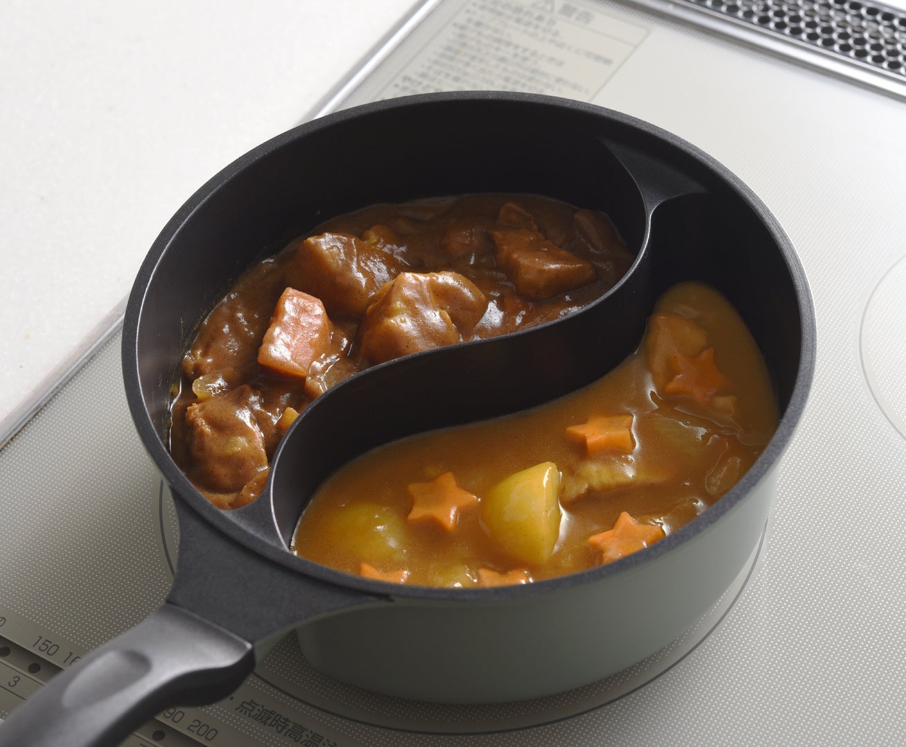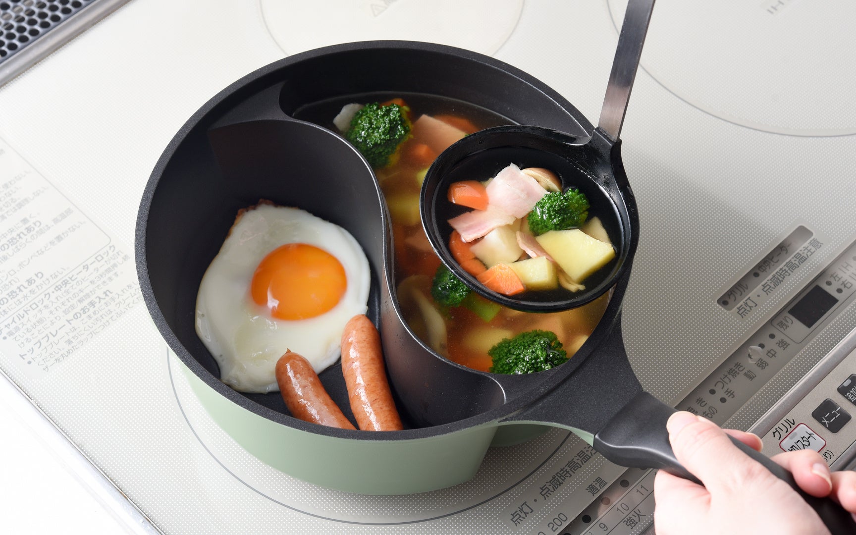 深さがあるので炒め物から煮物、汁物まで幅広い調理が可能です。おかずとスープを同時調理できるので朝ごはん作りにもオススメです。汁物は片側で約2人分作ることができます。内側はふっ素樹脂塗膜加工を施してあるため、料理がこびり付きにくくお手入れも簡単です。