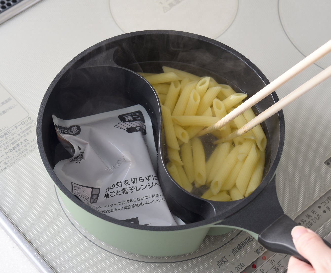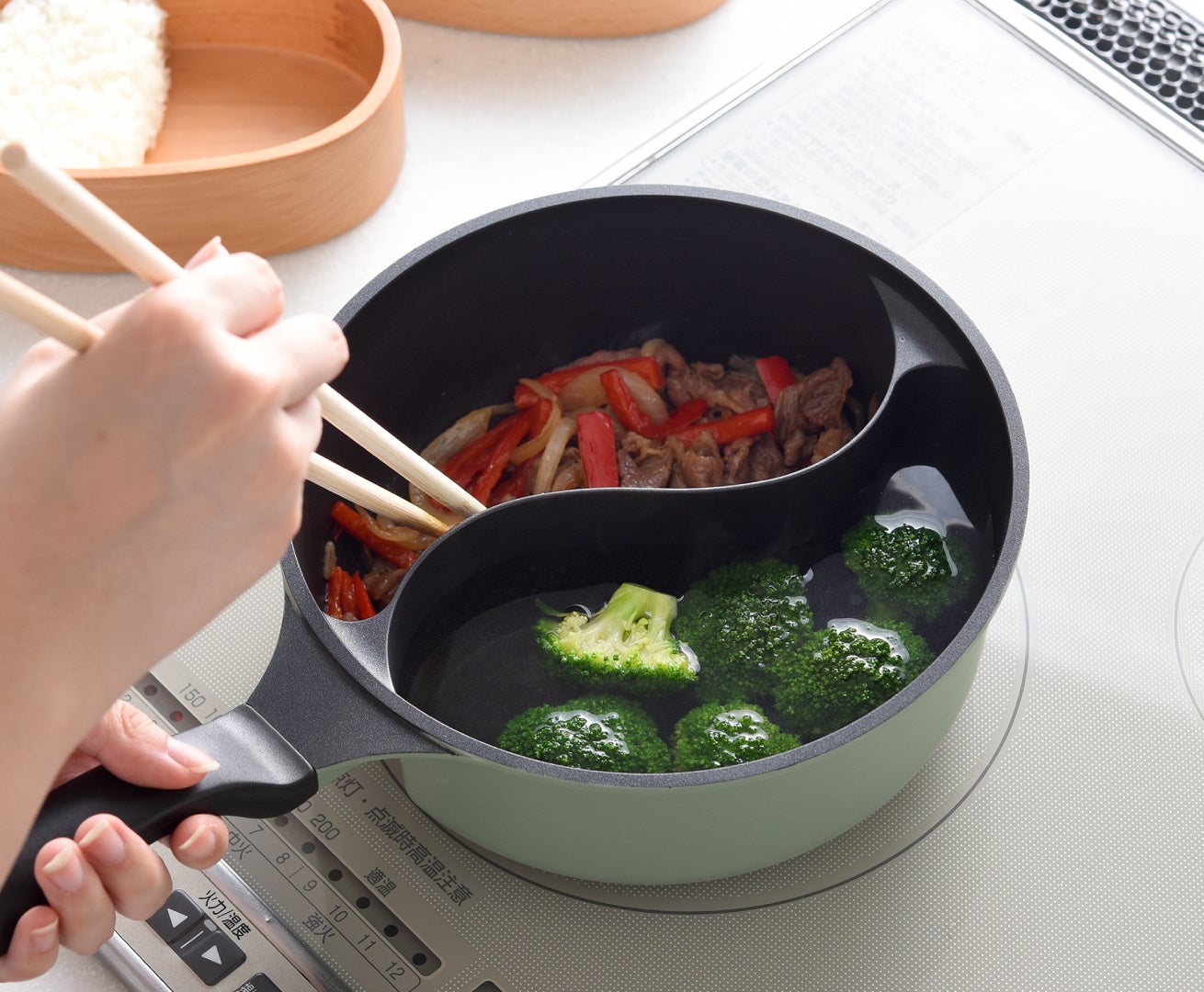 【ダブルクック片手鍋20cm オリーブ】は一度に2品同時調理ができる片手鍋です。