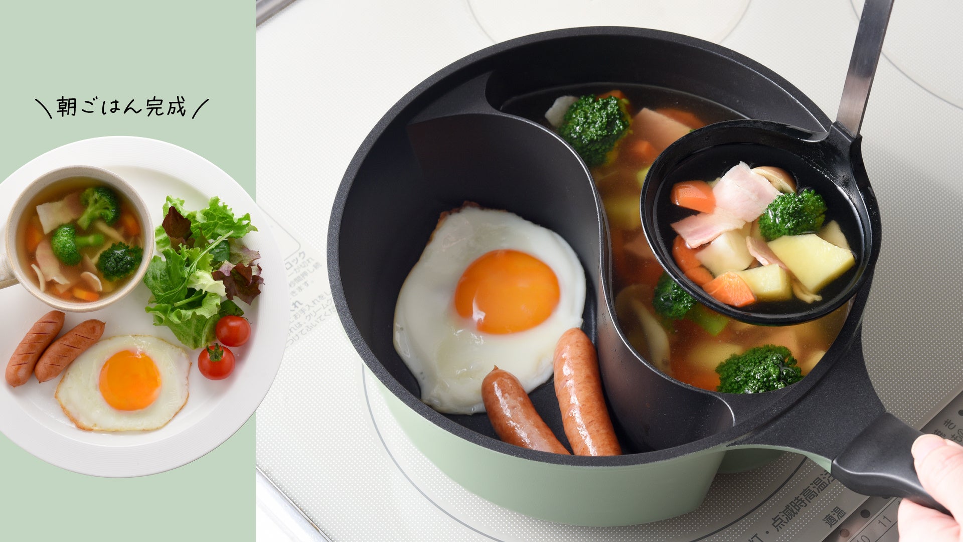 お弁当作りや、パスタとレトルトソースの同時調理、カレーの味分けや減塩調理など日常の色んなシーンで活躍します。調理器具が1 つで済むことで、電気代の節約だけでなく洗い物の手間や乾かすスペースも少なく済みます。