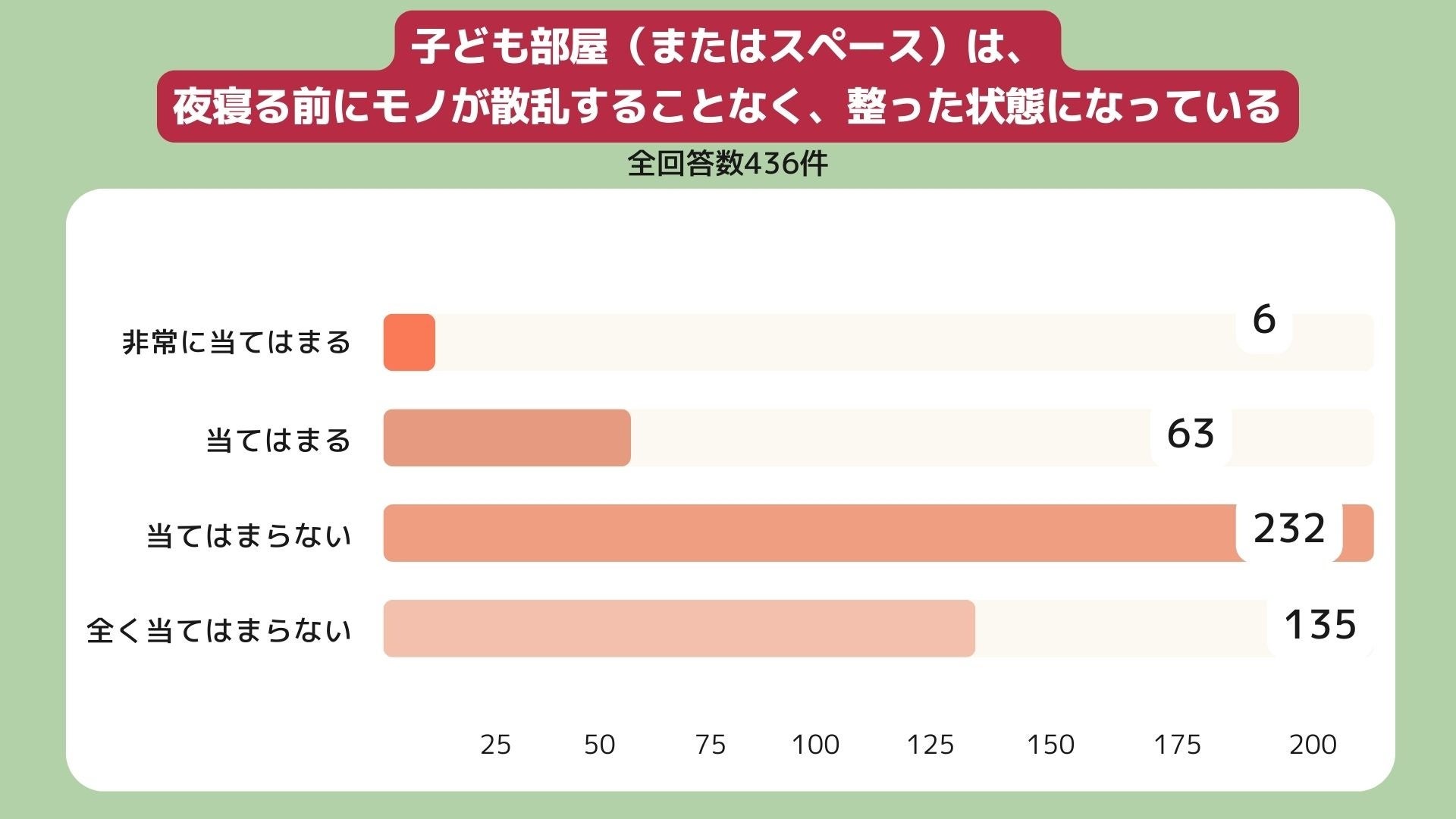 また、「子ども部屋は夜寝る前に整った状態になっている」と答えたのは全体の15%に留まり、85%の家庭では子ども部屋が散らかった状態で一日を終えていることが分かります。
