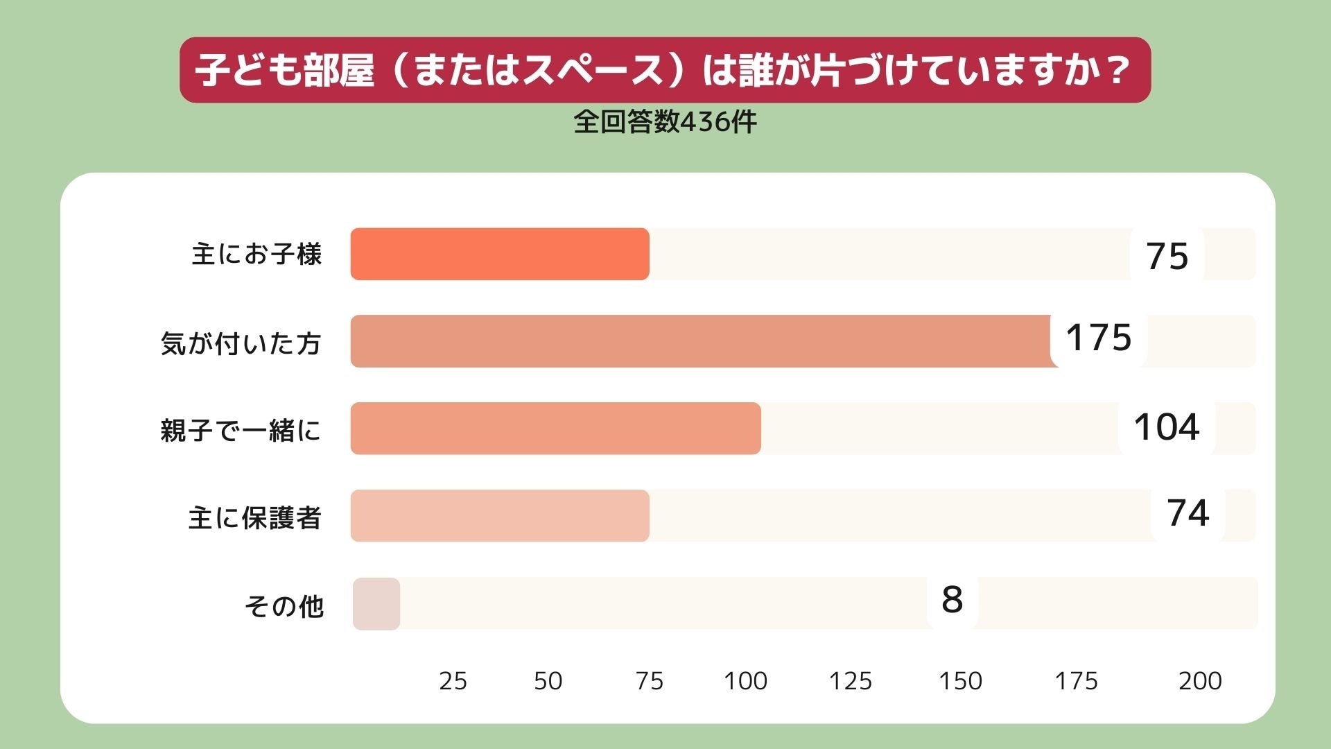 子ども部屋の片づけを誰が行っているか尋ねたところ、最も多い約40%が「気づいた方」と答えました。次いで約24%が「親子で一緒に」、主に子ども(75名)主に保護者(74名)がほぼ同じ約17%という結果でした。