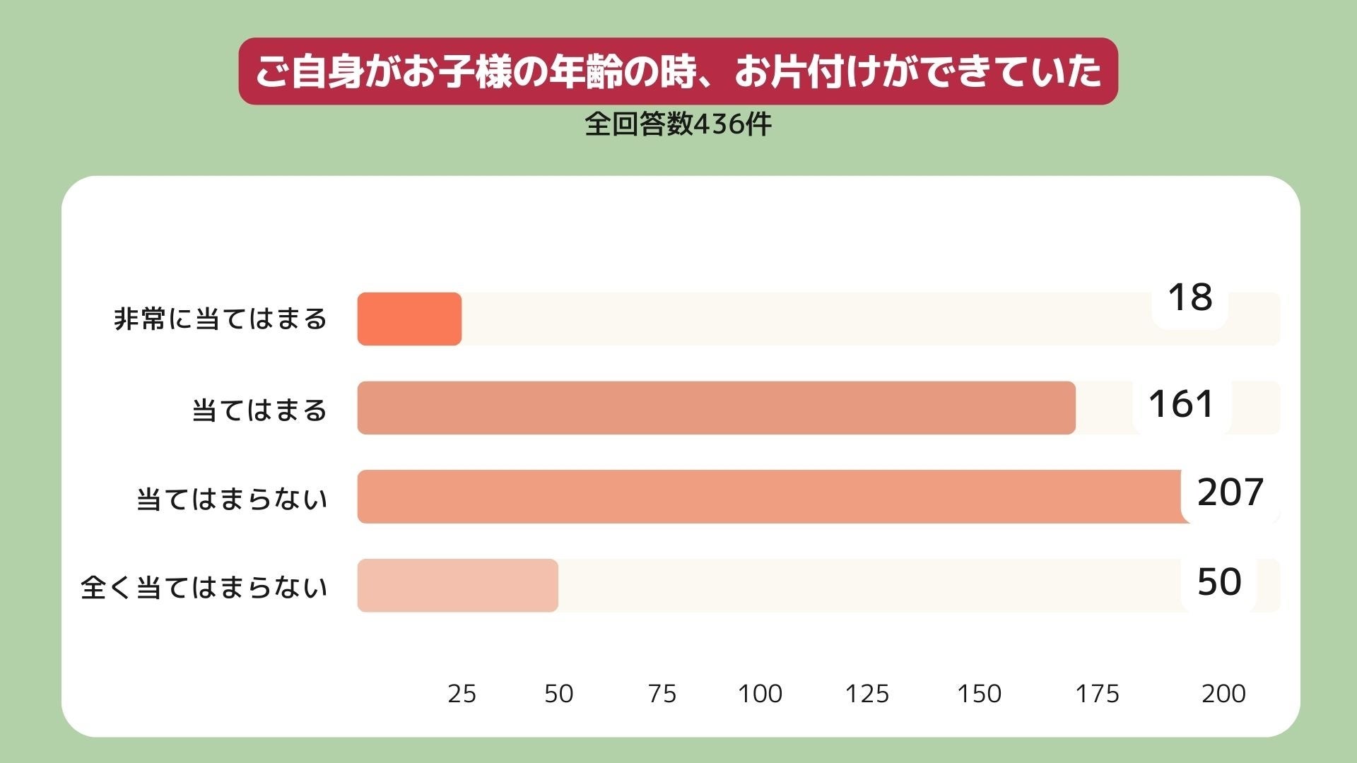 また、保護者に今のお子様と同じ年齢の頃に片づけができていたか尋ねたところ、約59%の人が「当てはまらない」と回答しました。