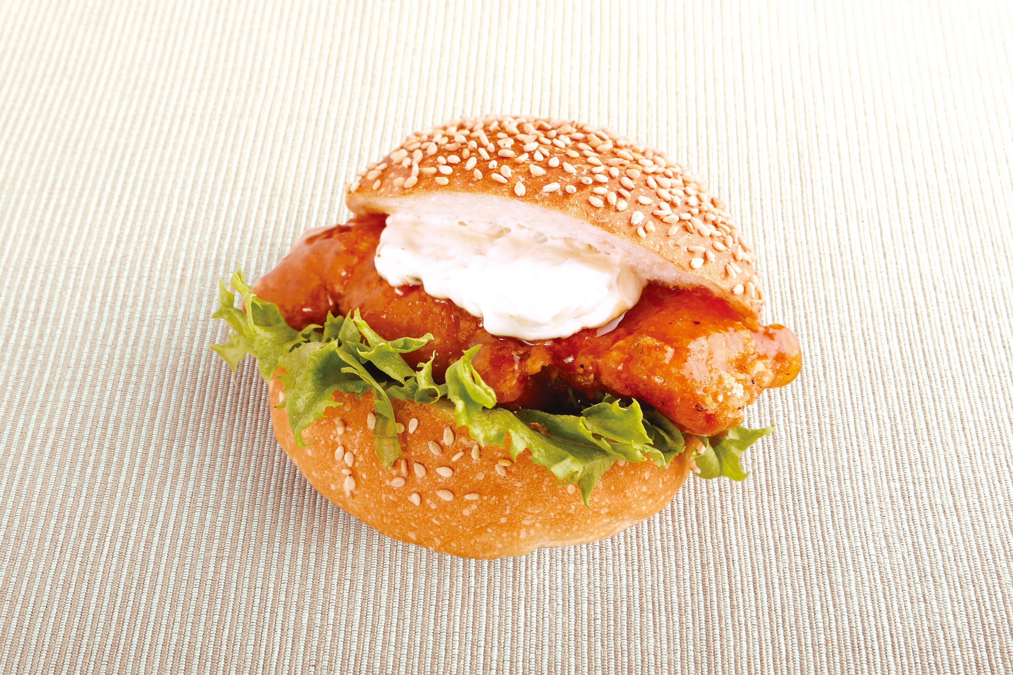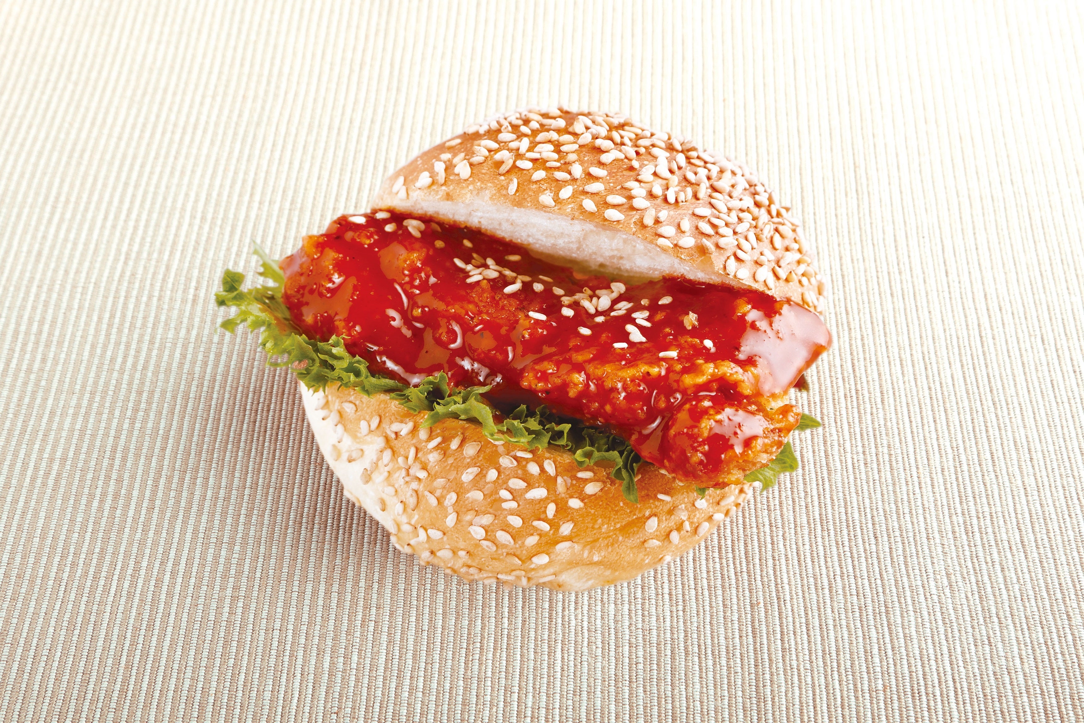 ジューシーなフライドチキンにコチュジャンが効いた甘辛ダレをたっぷり絡めてサンドした食欲そそる旨辛バーガー。