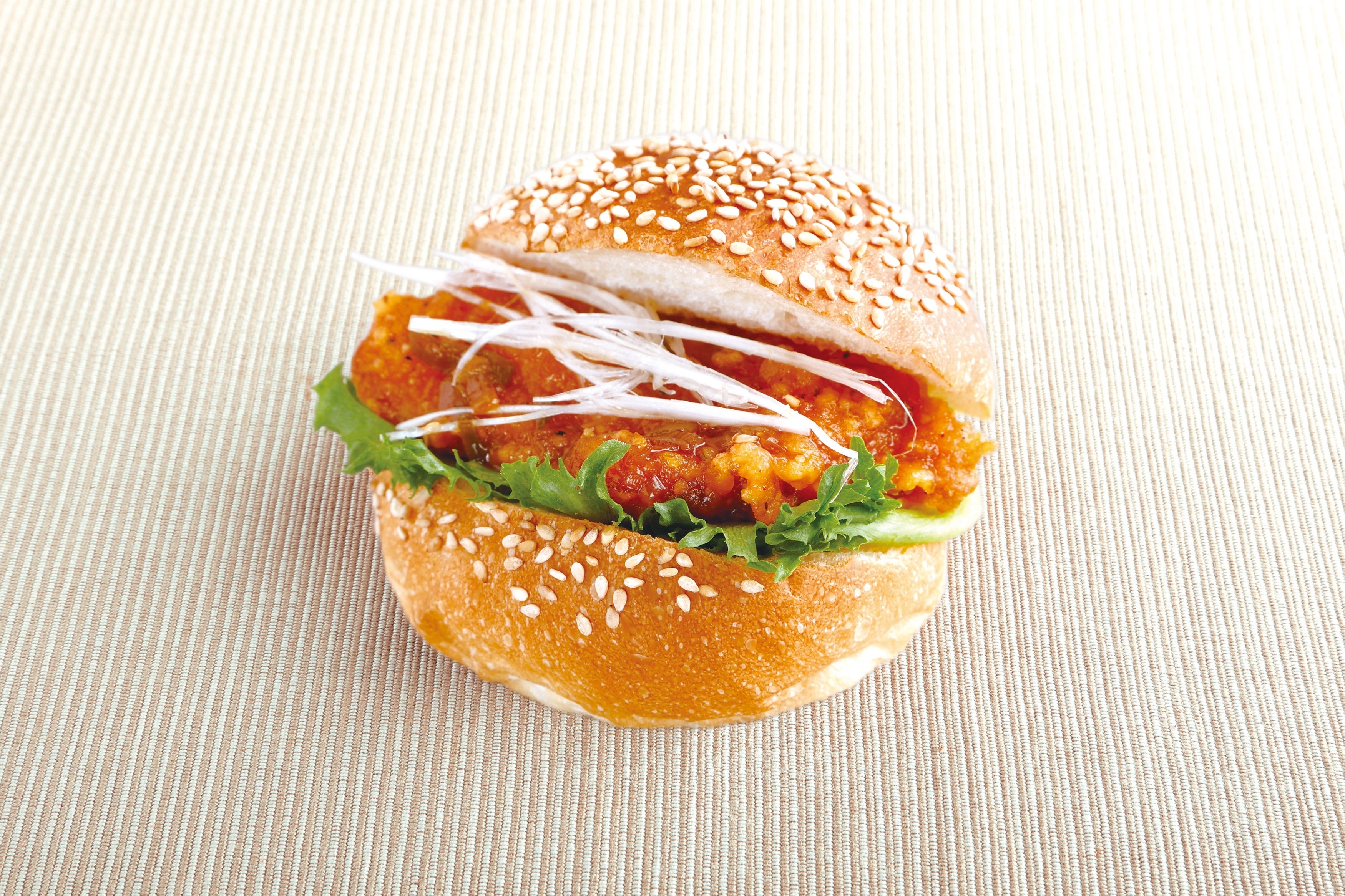 ジューシーなフライドチキンにユーリンチーのタレをたっぷり絡め、白髪ねぎをトッピングしたさっぱりとした味わいのバーガー。