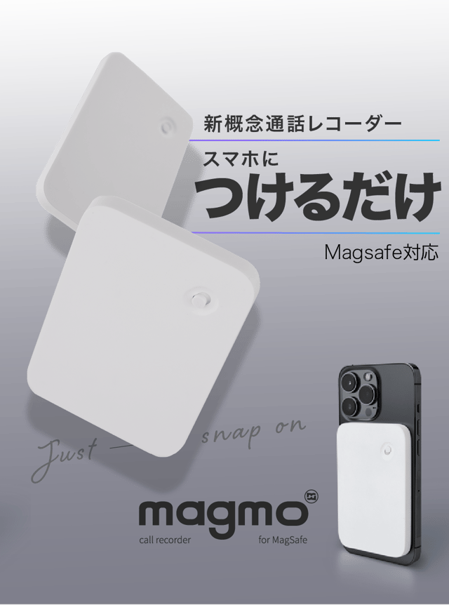iPhone通話レコーダー「Magmo」はiPhone背面のMagsafeマグネットを通じて取り付けて使用する方式の通話録音レコーダーです。