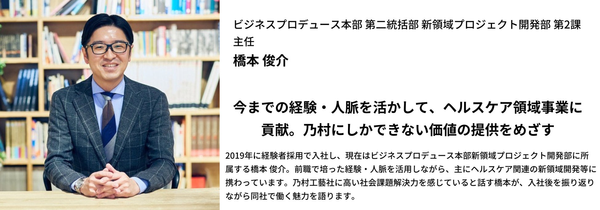 今までの経験・人脈を活かして、ヘルスケア領域事業に貢献。乃村にしかできない価値の提供をめざす