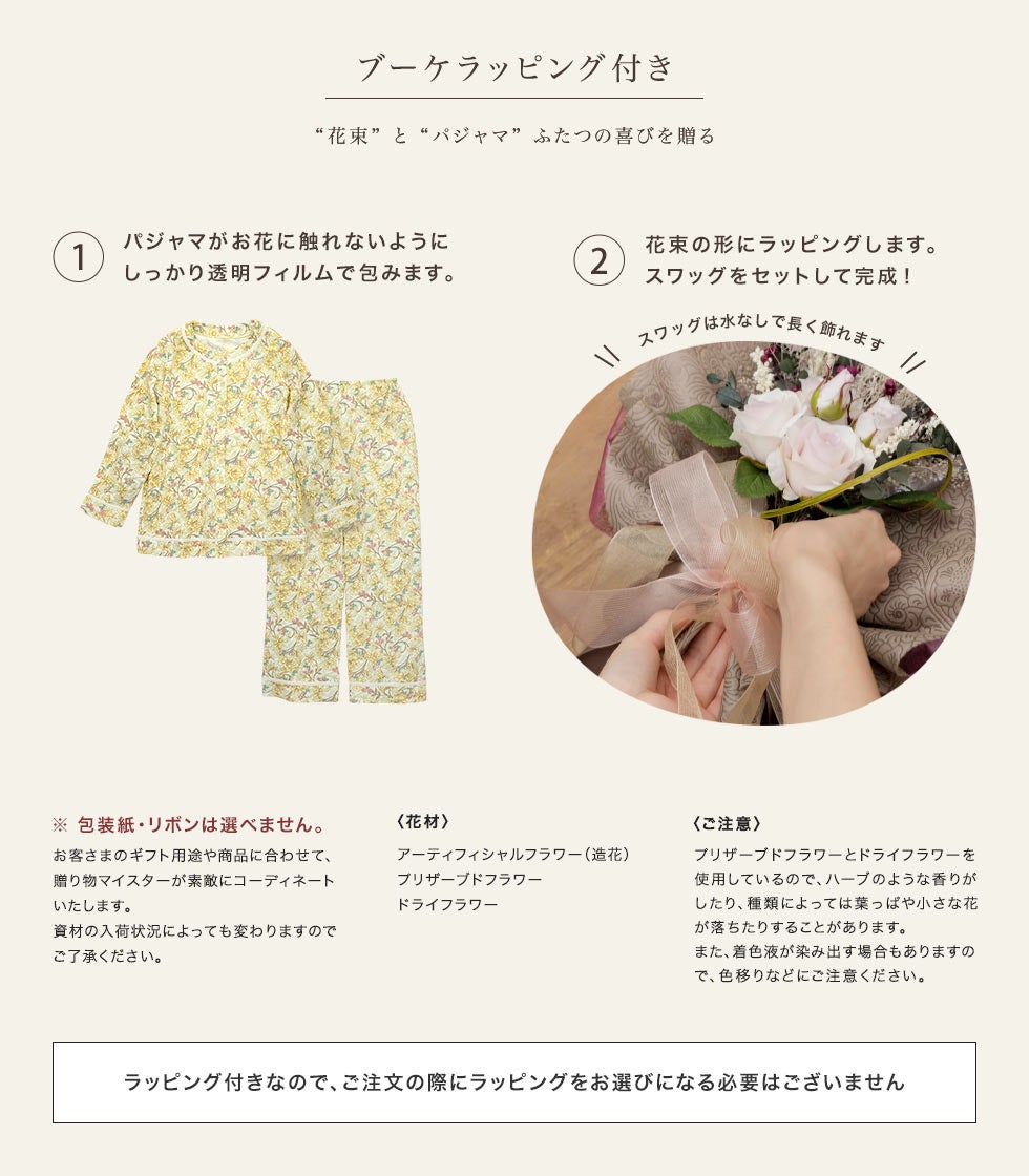 もう迷わない!母の日は、お花と一緒にパジャマを贈ろう!花柄パジャマをオリジナルブーケで包み込んだ華やかな贈り物。花くるみシリーズの3種類(前開きパジャマ・Tシャツパジャマ・ワンピース)から選べます♪