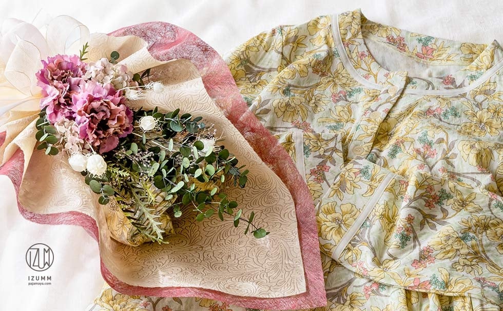 オリジナルパジャマブランド「パジャマ屋IZUMM」(https://www.pajamaya.com/)を運営する株式会社フレックス(代表:熊坂泉、本社:神奈川県相模原市)は、今までの母の日とは全く違うサプライズを届けられる、ブーケラッピング付きの花くるみパジャマを3種販売開始♪華やかな黄色の花に包まれた、柔らかな肌心地の花くるみパジャマに、オリジナルのブーケを組み合わせたギフトセットです。「今年の母の日は何にしよう?」とお悩みの方必見!”花束”と”パジャマ”で「嬉しさ2倍」に!母の日にいつもと違う感動をプレゼントするのはいかがでしょうか。