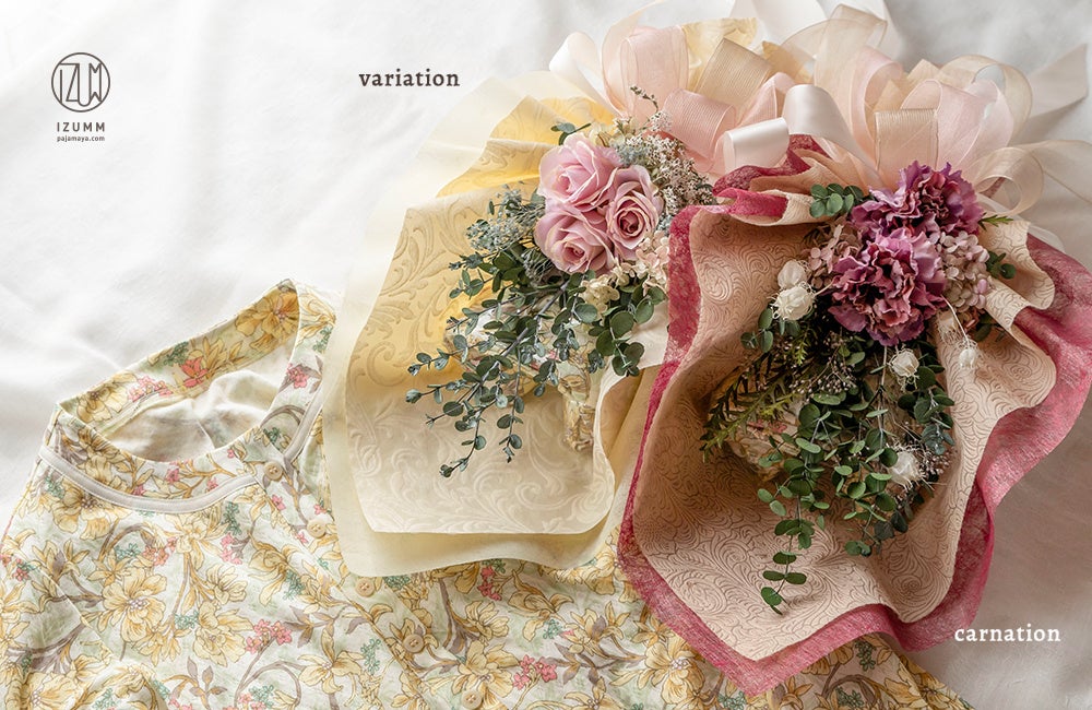 母の日の定番の「カーネーション」またはギフトラッピングのプロにお任せする「バリエーションフラワー」の2種類から選べるオリジナルブーケに、お好みのパジャマを組み合わせて。