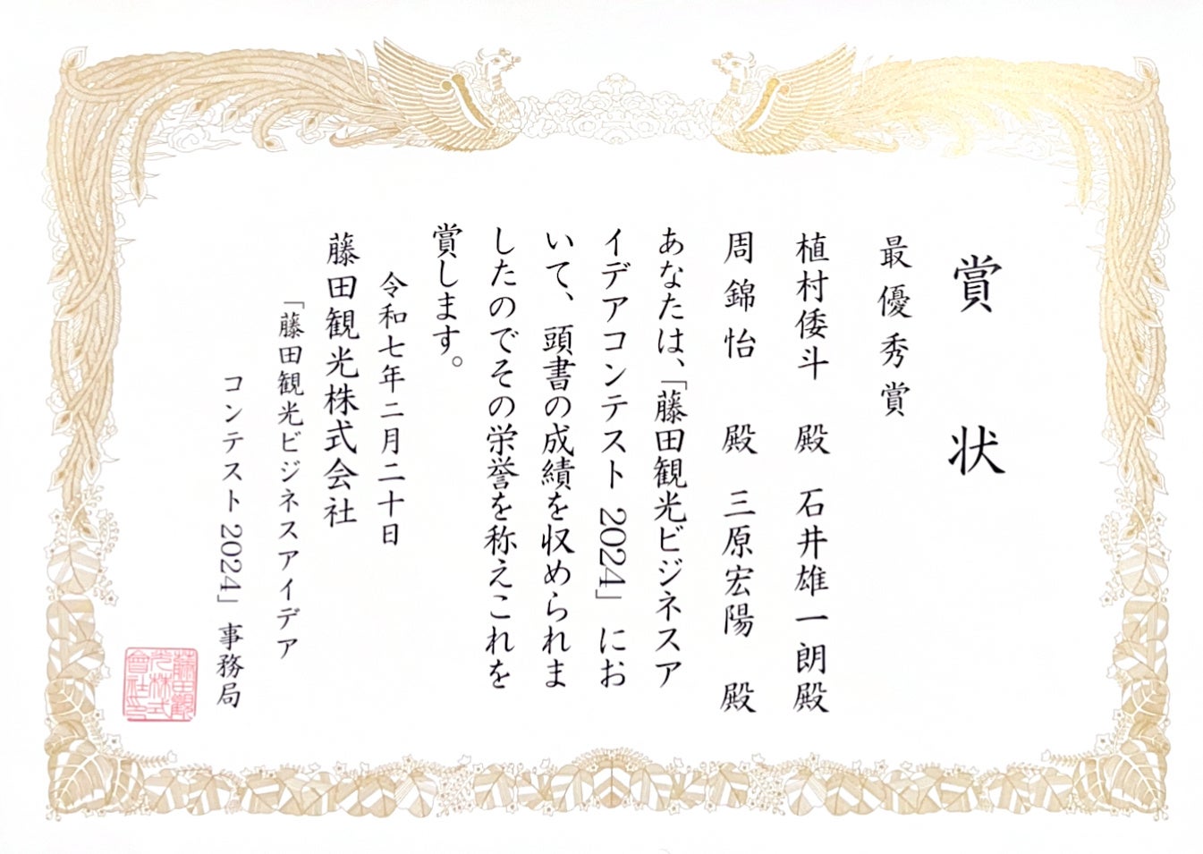 二松学舎大学 小具龍史ゼミ(国際経営学科)所属の学生4名が「藤田観光ビジネスアイデアコンテスト2024」で最優秀賞を受賞しました‼