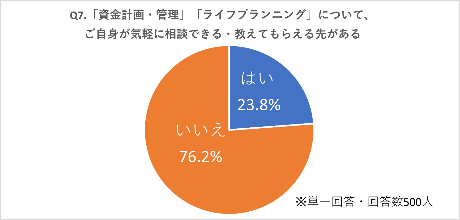 「資金計画・管理やライフプランニングについて、ご自身が気軽に相談できる・教えてもらえる先があるか」と質問したところ、「いいえ」と回答した人が76.2%と、気軽に相談ができる先がない人が7割を超えていることが分かりました。