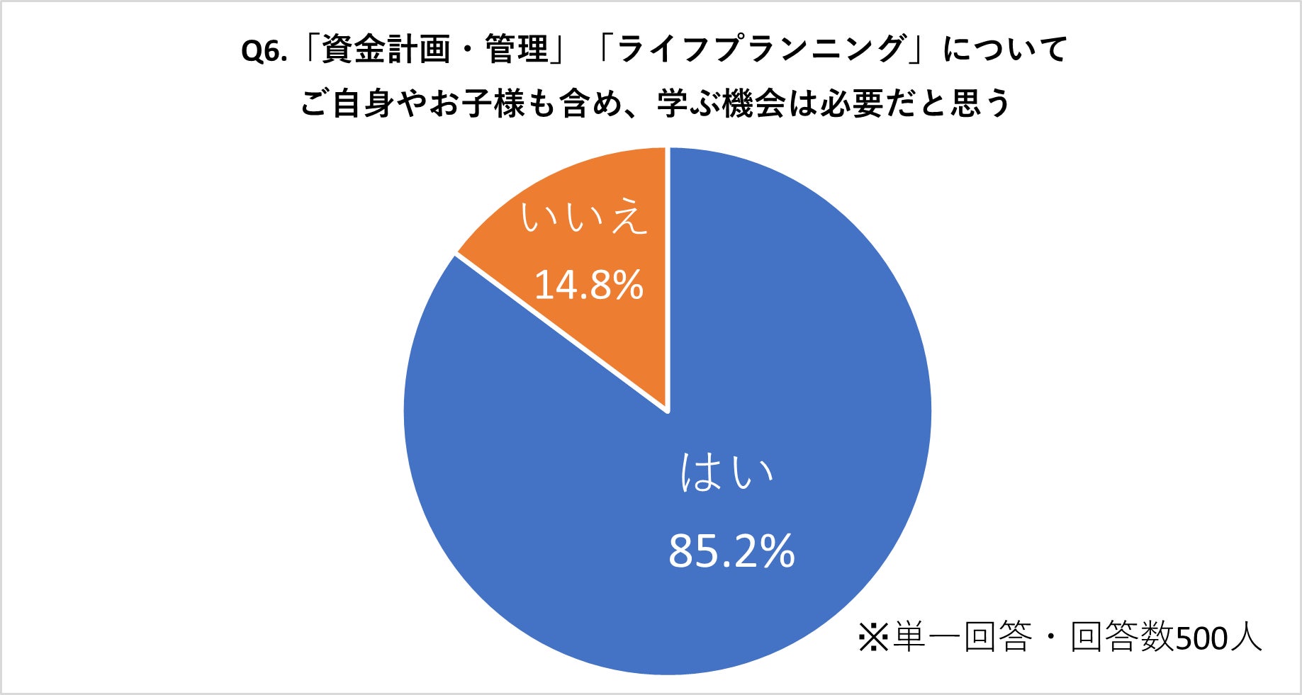 「資金計画・管理やライフプランニングについてご自身やお子様も含め、学ぶ機会は必要だと思うか」という質問をしたところ、「はい」が85.2%となり、学ぶ機会が必要だと考えている人が8割を超える結果となりました。