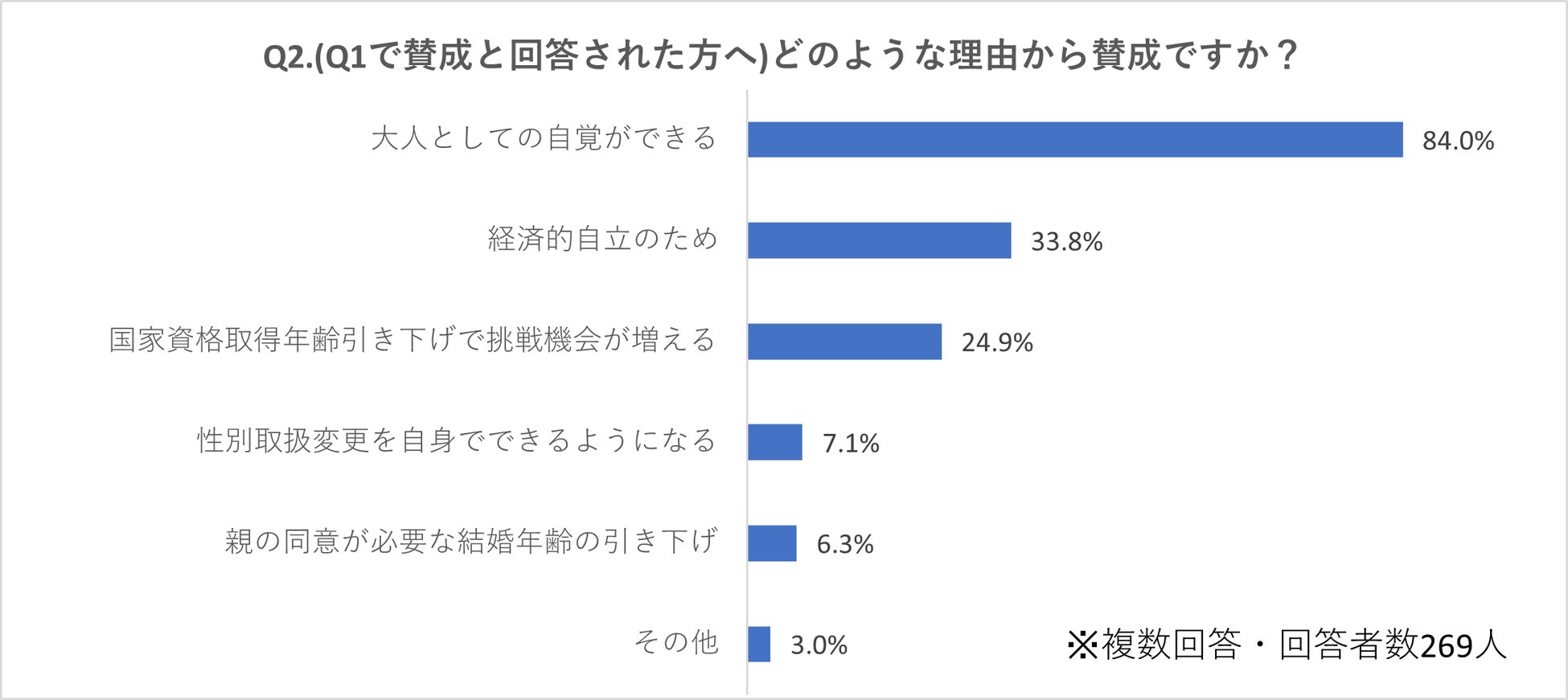 「(Q1で賛成と回答された方へ)どのような理由から賛成ですか?」という質問をしたところ、最多の回答が「大人としての自覚ができる」84%、次いで「経済的自立のため」33.8%という回答となりました。