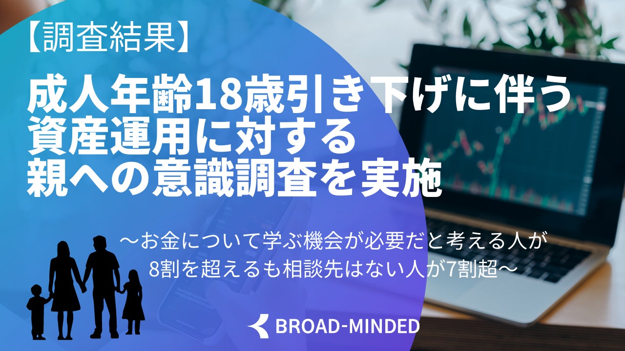 保険・証券・住宅ローンと複数の金融商品を横断して1社で取り扱うブロードマインド株式会社(本社:東京都渋谷区 代表取締役社長:伊藤清 証券コード:7343 以下:当社)は、18歳以下の子を持つ、親(20代~50代の男女500名)に、「成人年齢の引き下げに伴う、資産運用に対する意識調査」を行いました。