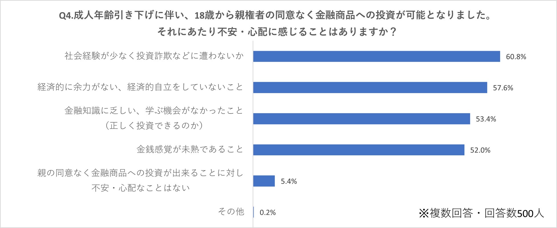 「成人年齢引き下げに伴い、18歳から親権者の同意なく金融商品への投資が可能となりました。それにあたり不安・心配に感じることはありますか?」と質問したところ、最多の回答が「社会経験がなく、投資詐欺などに遭わないか」60.8%、次いで「経済的に余力がない、経済的自立をしていないこと」57.6%という回答になりました。親の同意なく投資が出来ることに対し不安なことはないと回答した人が、5.4%に止まったことから、成人年齢引き下げに対しては賛成でも、何かしら不安はある人が多いことが分かります。