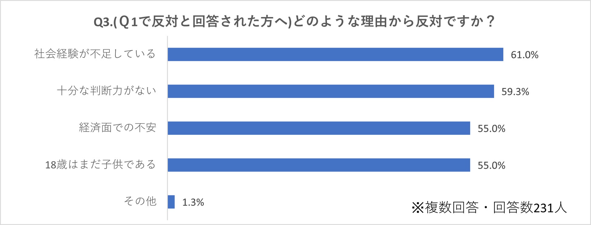 「(Q1で反対と回答された方へ)どのような理由から反対ですか?」という質問をしたところ、最多の回答が「社会経験が不足している」61%、次いで「十分な判断力がない」59.3%という回答になりました。