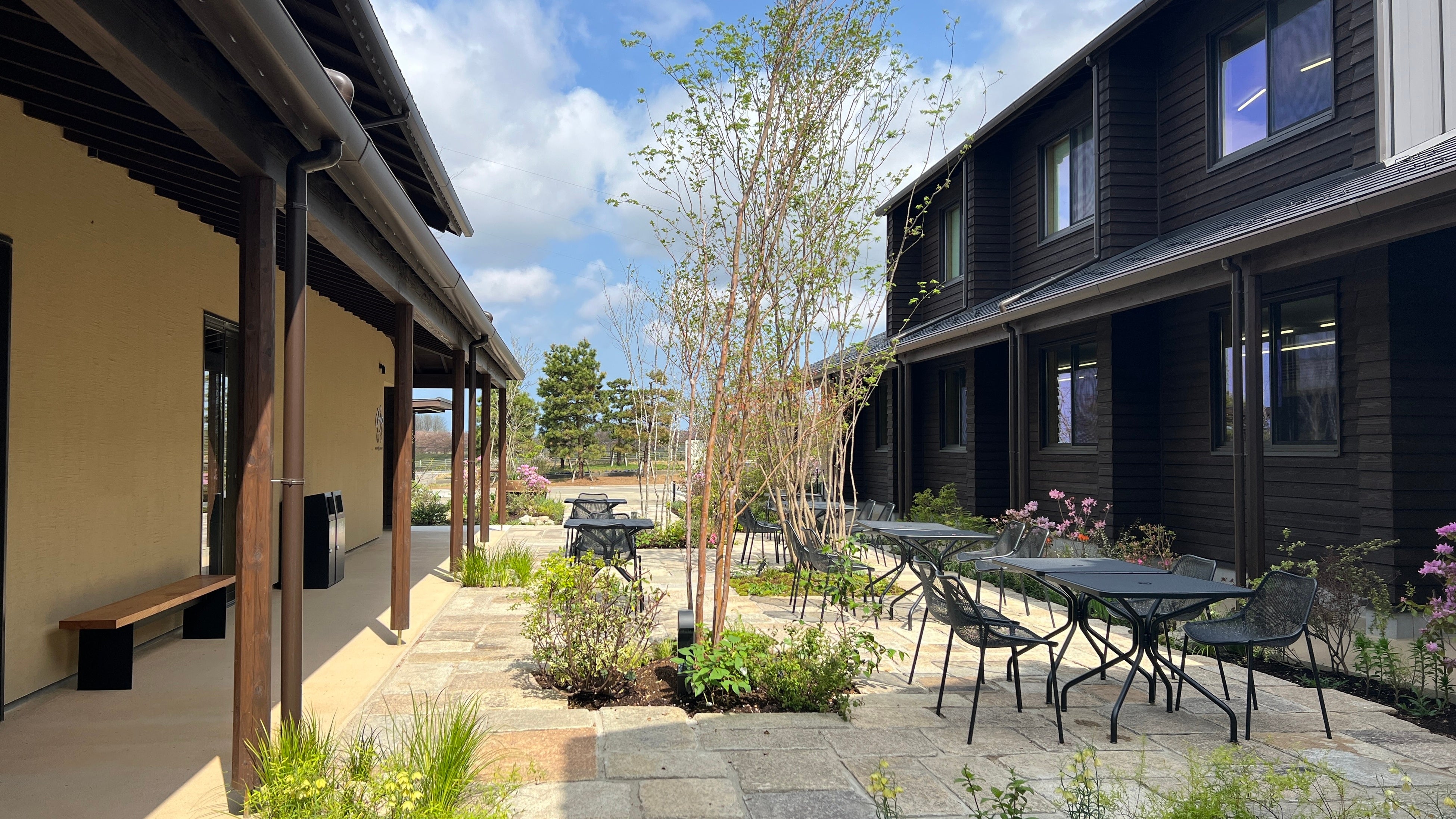 緑に囲まれた心地よい屋外空間。のんびり過ごす場所でもあり、みんながたのしめる、にぎわいの場にもなります。
