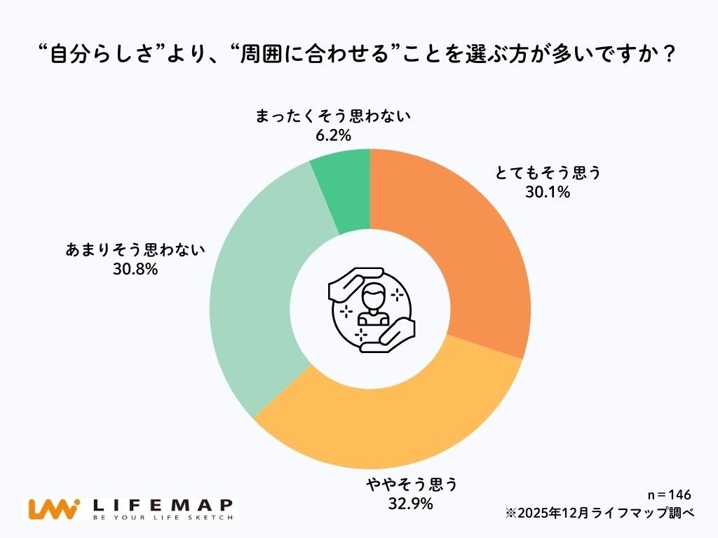 「“自分らしさ”より、“周囲に合わせる”ことを選ぶ方が多いですか?」という問いに対し、63.0%の高校生が「とてもそう思う」「ややそう思う」と回答しました。内訳は、「とてもそう思う」が30.1%、「ややそう思う」が32.9%となっており、自分らしさよりも周囲との関係性を優先する場面が少なくないことがうかがえます。