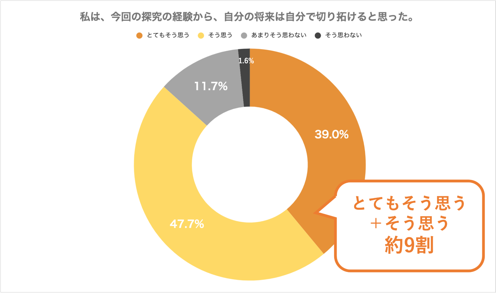 「今回の探究の経験から、自分の将来は自分で切り拓けると思ったか」という設問に対し、全体の約9割が「そう思う」と回答しました(「とてもそう思う」「そう思う」の合計)。