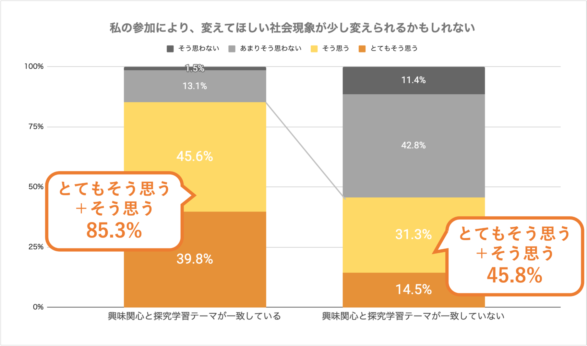 また、「私の参加により、変えてほしい社会現象が少し変えられるかもしれない」という設問で、興味関心と探究学習のテーマが一致している生徒と、一致していない生徒を比較すると、前者の方が「そう思う」と答えた割合が高く、自分の興味関心のあるものをテーマに設定した人ほど、社会に対する自己効力感が上がるということが分かりました。