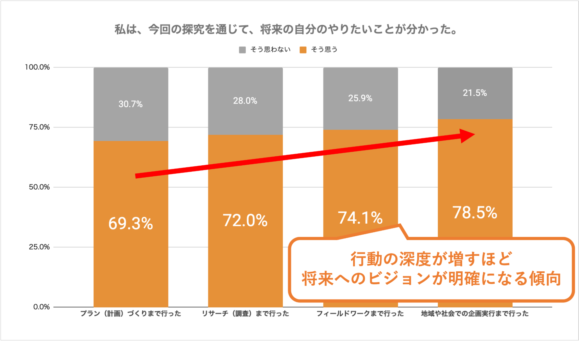 さらに、「今回の探究学習を通じて、将来の自分のやりたいことがわかったか」をたずねる設問で、行動の深度(計画・調査・フィールドワーク・企画実行)別にその結果を見てみると、深く行動している生徒ほど「そう思う」と回答する割合が高くなっており、探究学習が実践的になるほど将来へのビジョンが明確になる傾向が見てとれます。