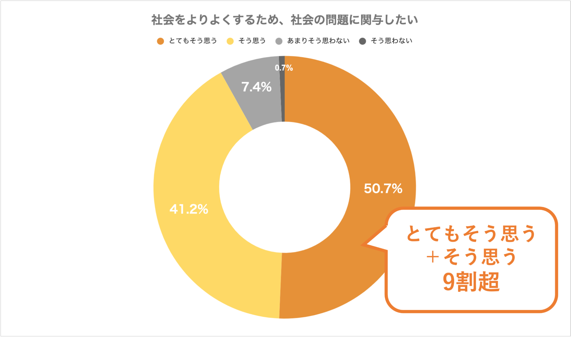 また、「社会をよりよくするため、社会の問題に関与したいか」という設問に対しても、「とてもそう思う」「そう思う」を合わせた肯定的回答が9割超という結果となりました。