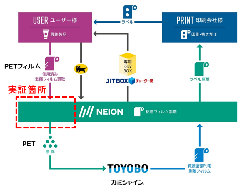 ラベルや工業用テープなどの粘着製品に使用されるPETフィルムセパレーターなどの台紙部分は、多くの場合廃棄・燃焼されている。これらをPET合成紙製のリサイクル専用セパレーターに置き換え、ユーザー使用後に回収、マテリアルリサイクルすることで、再びリサイクル専用セパレーターの原料として使用する実証を行う。実証を2024年3月に完了させ、以後、量産化を進める計画。