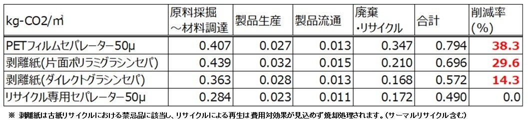 粘着製品の台紙に使用される代表的な材料を「リサイクル専用セパレーター」に置き換えた場合のCO2削減効果について、環境省「再生可能エネルギー及び水素エネルギー等の温室効果ガス削減効果に関するLCAガイドライン」に則り、当社自主基準で算出。PETフィルムセパレーター50μからの置き換えは38.3%、剥離紙(片面ポリラミグラシンセパ)からの置き換えは29.6%、剥離紙(ダイレクトグラシンセパ)からの置き換えは14.3%のCO2削減効果を見込んでいる。実証事業を通じ、数値を精査し公表する方針。