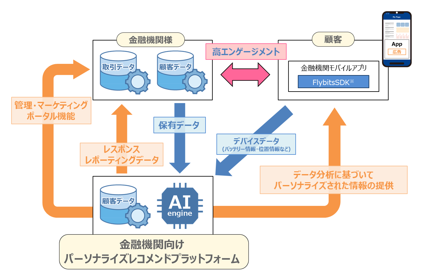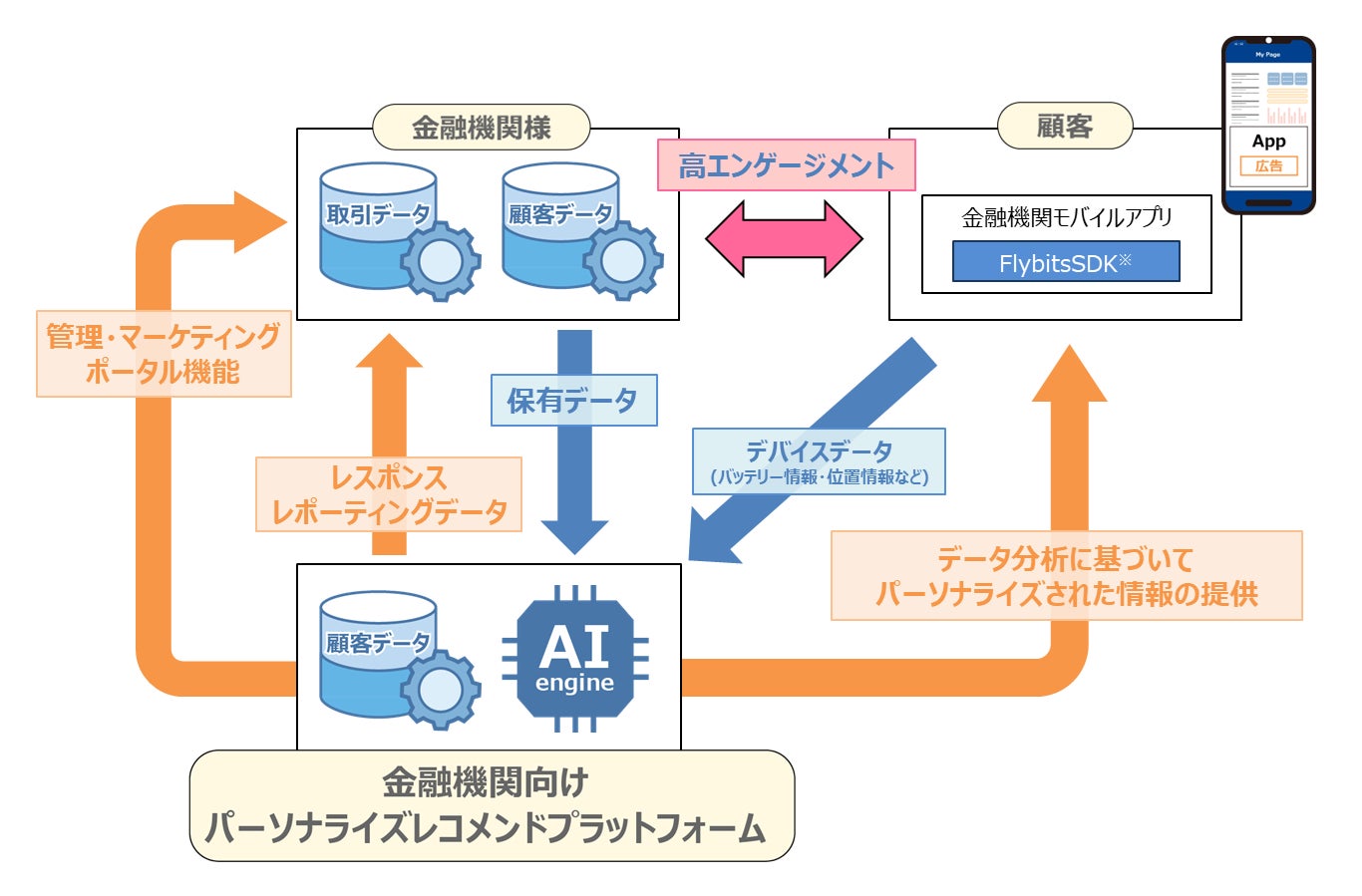その中で見えてきた上記の課題解決に向け、このたび、「Flybitsソリューション」の販売代理店となり、「金融機関向けパーソナライズレコメンドプラットフォーム」として販売を開始します。