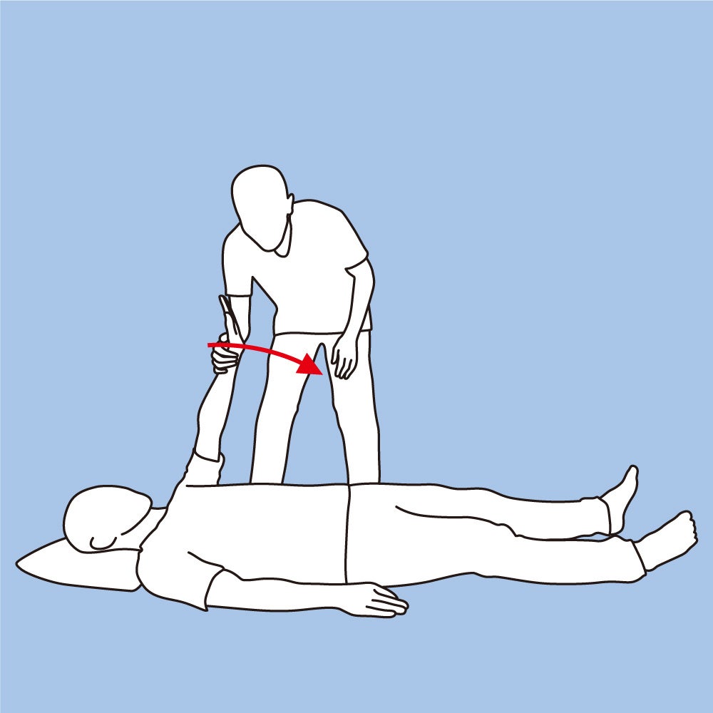 ②上げた手を足の方向に押してもらい、倒れないように押し返す。