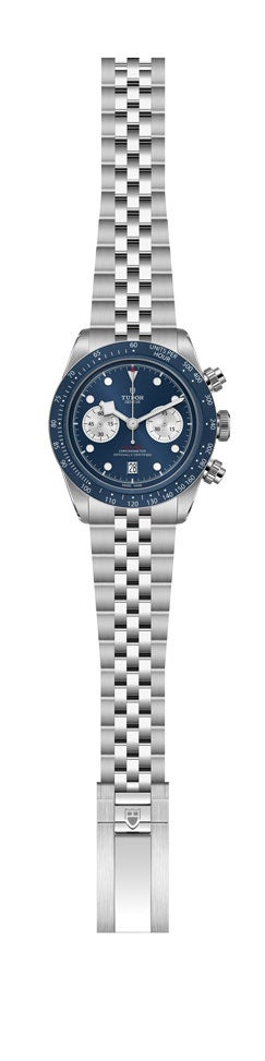 ブラックベイの美学に忠実なブラックベイ クロノは、1969年以来チューダーのダイバーズウォッチのアイコンとなっている有名な「スノーフレーク」針を採用し、2つのシルバーサブカウンターが配され、最適な視認性を確保するために磨きがかけられたドーム型ブルーダイアルを備える。初期のチューダー クロノグラフに着想を得て、45分カウンターと6時位置にカレンダーを備えるダイアル。41 mmのスチール製ケースを舞台に、ブラックベイラインの特徴である、サテンブラッシュドとポリッシュ仕上げ、そして面取りされたラグとチューダーローズが刻印されたリューズが存在感を示す。チューダーならではの細部に至るこだわりの典型であるステンレススチール製プッシャーのデザインは、初期のチューダーのクロノグラフから着想を得ている。ブルーのアルマイト加工インサートとタキメーター目盛りを備えたステンレススチール製固定ベゼルが、このスポーティクロノグラフの外観と機能を演出している。