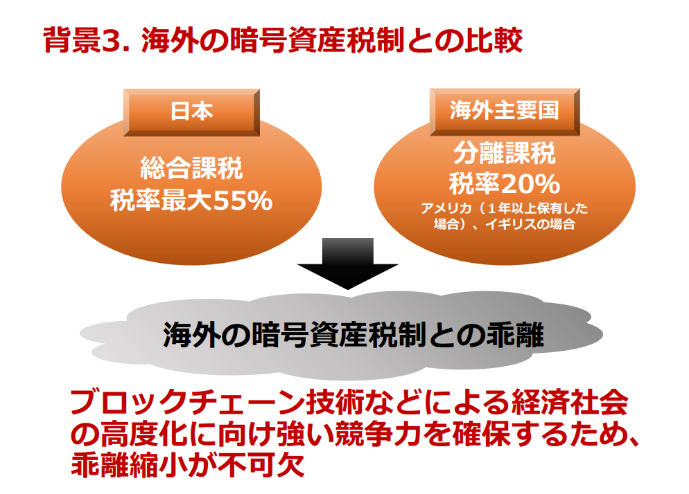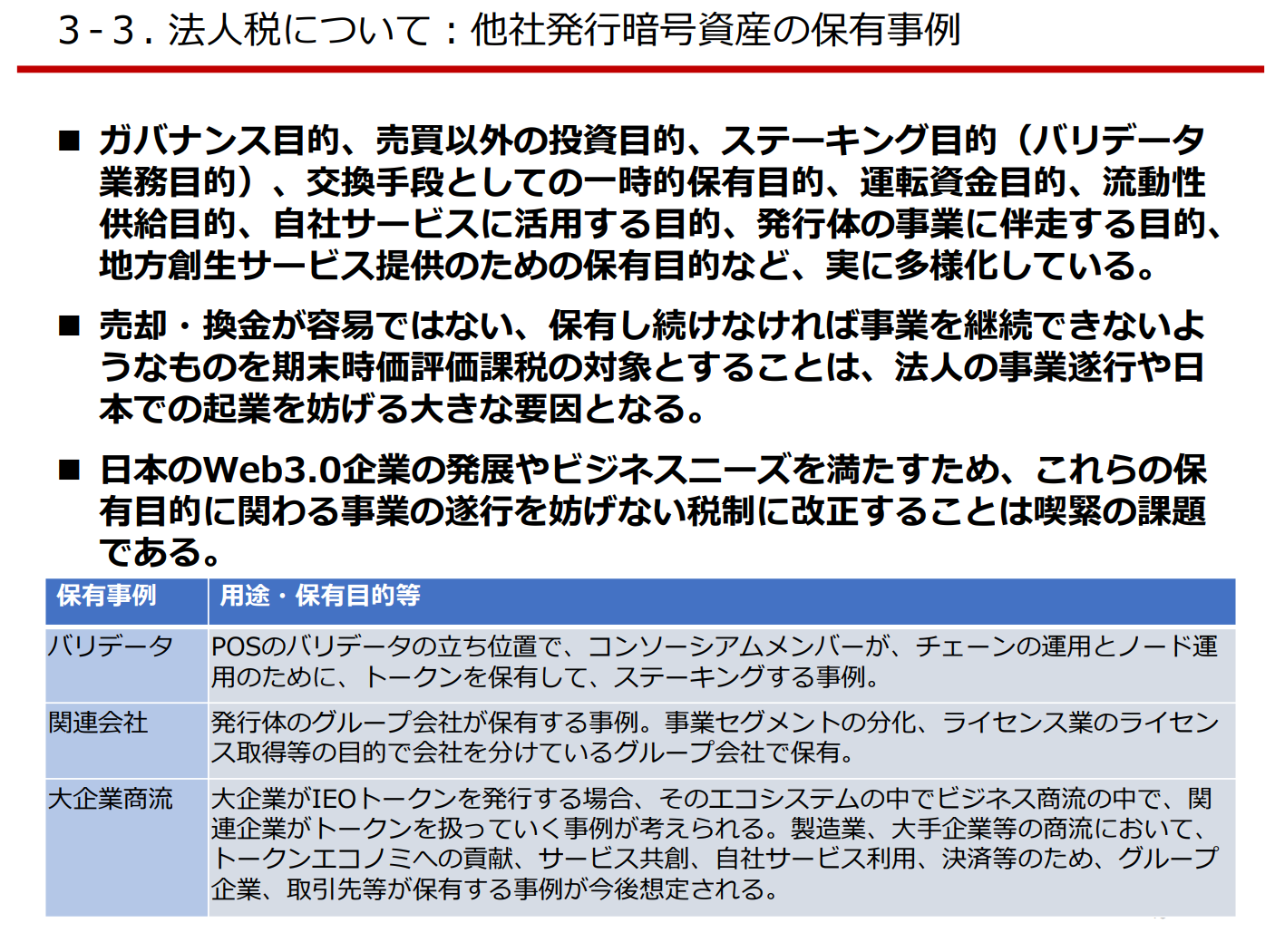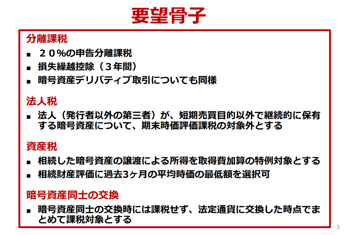 Web3.0産業活性化のため、20%申告分離課税と損失繰越、発行者以外の第三者法人が保有する暗号資産法人税、資産税、暗号資産同士の交換時に係る課税の整備を要望