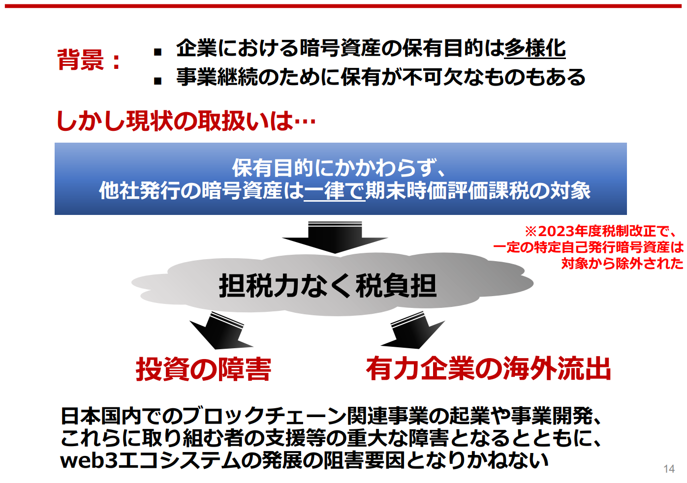 これらのWeb3.0では暗号資産・パブリックブロックチェーンが基盤となりますが、日本においては、2023年の税制改正で自社発行暗号資産に係る法人税の改正がなされたものの、その他未だ残る税制面の課題が起業家・利用者の障壁となり、利活用の遅れや人材の海外流出を生じさせています。