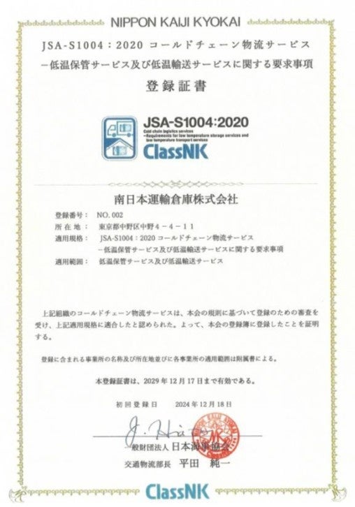 チルド・フローズン食品輸送の南日本運輸倉庫株式会社(本社:東京都中野区、代表取締役社長:大園 圭一郎 以下、当社)は、「JSA-S1004:2020コールドチェーン物流サービス―低温保管サービス及び低温輸送サービスに関する要求事項」について佐野チルドフローズン物流センターと藤沢営業所の2か所で一般財団法人日本海事協会から認証を受けましたので、お知らせいたします。