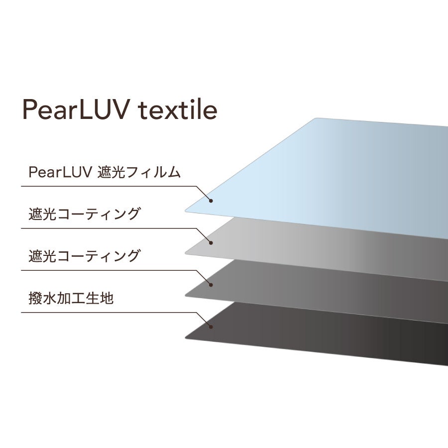 PearLUVは生地の表面にパール顔料を使用した遮光フィルムを新たに使用することにより、美しい光沢と共に最高水準の遮光性と紫外線遮蔽率を実現しています。(遮光率99.9%以上 UVカット率99.9%以上 撥水防水加工)