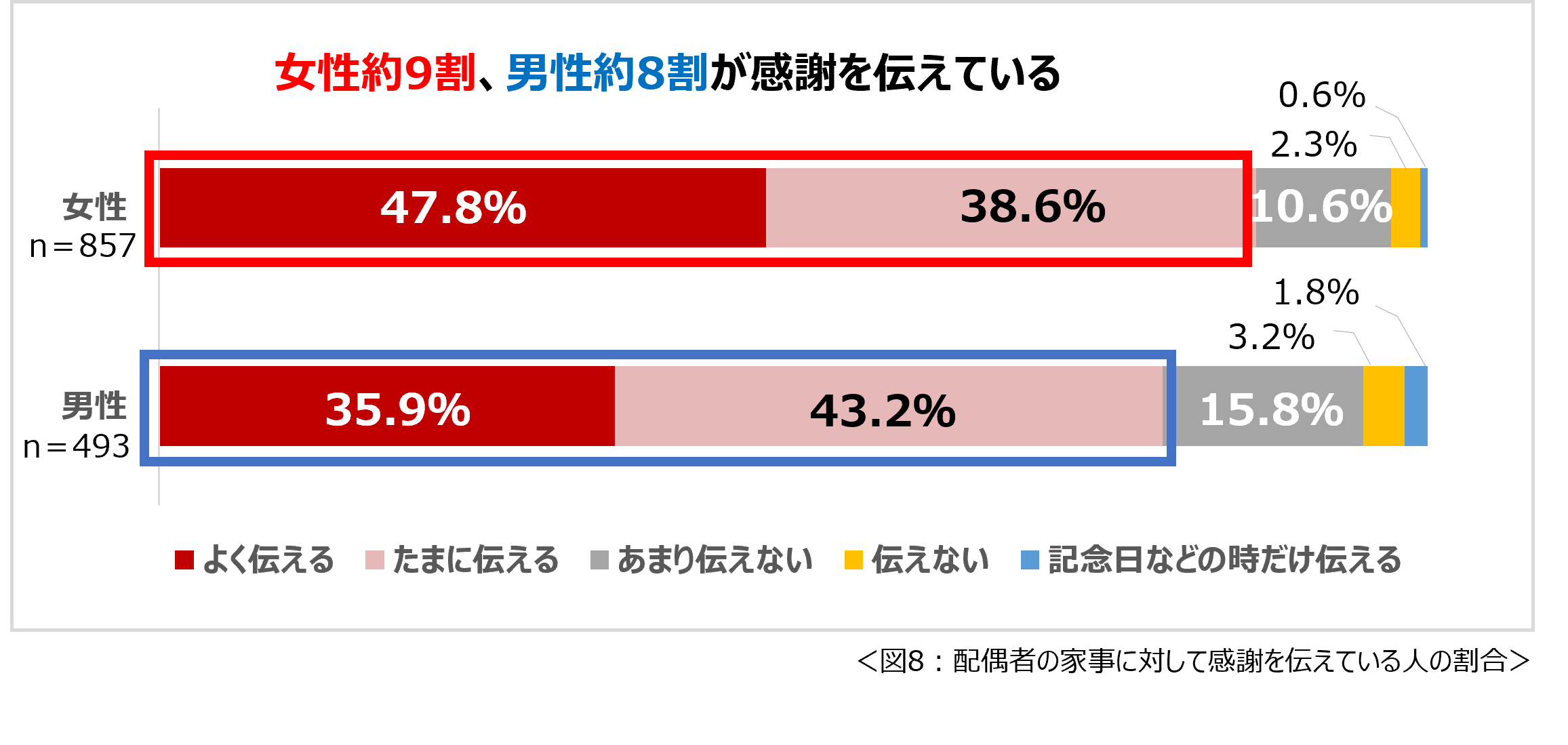 一方で、「配偶者に家事に対しての感謝を伝えていますか」という問いに、「よく伝える」「たまに伝える」と回答した割合を合わせると、女性が約9割、男性が約8割で、多くの人が配偶者に感謝を伝えていることがわかりました。(図8)